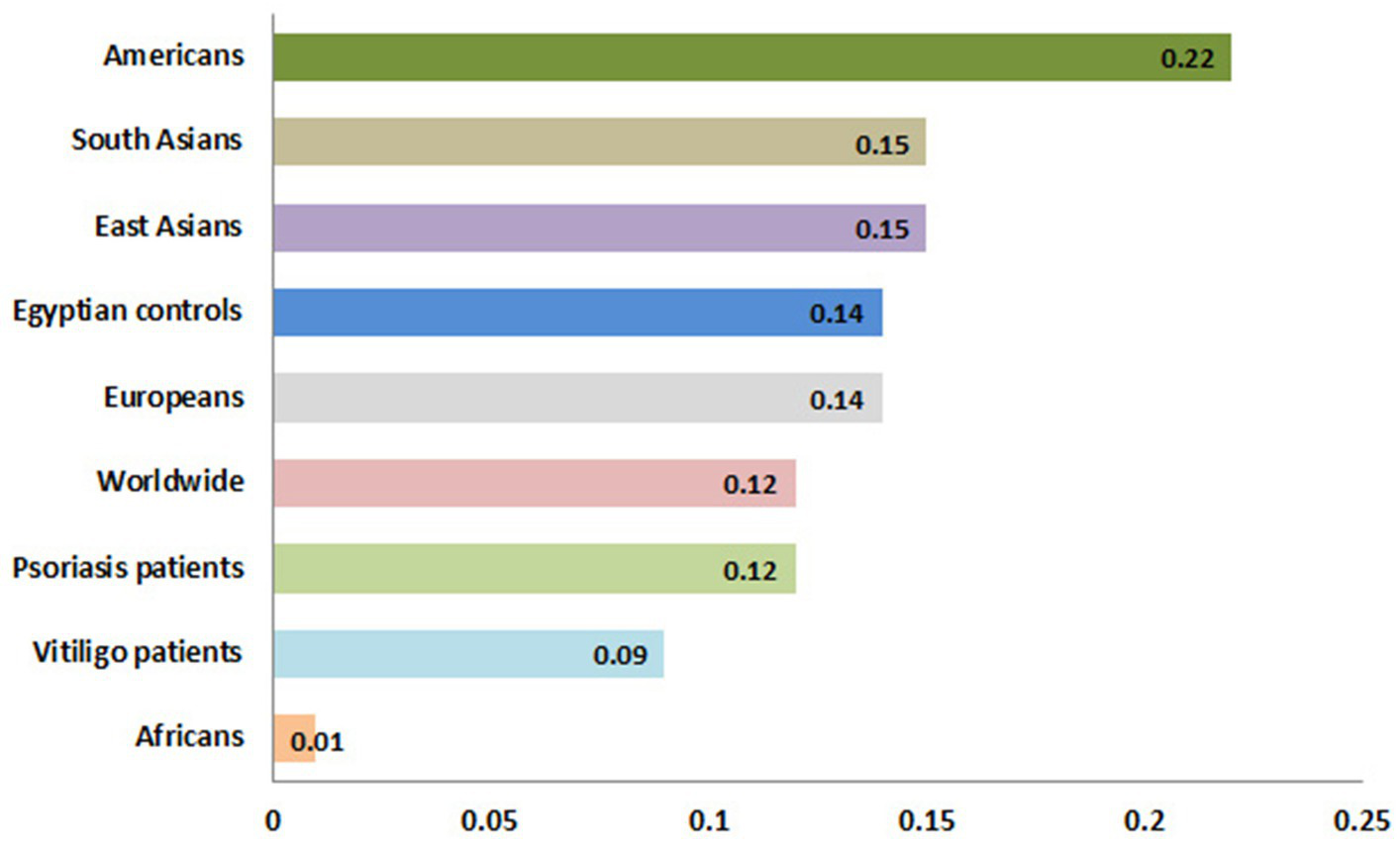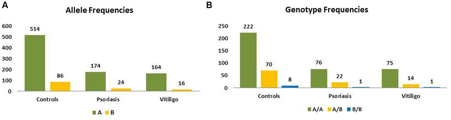 Psoriasis and vitiligo are inflammatory autoimmune diseases with genetic factors playing a remarkable role in both diseases (1). Psoriasis is an inflammatory skin disease that is characterized by the development of scaly and erythematous plaques with a global prevalence of approximately 2% (2, 3). Its pathogenesis comprises intricate interactions between the adaptive immune system and the innate immune system (4). Meanwhile, vitiligo represents an autoimmune disease of the skin characterized by autoimmune melanocyte destruction, resulting in the related depigmentation patches affecting the skin in addition to mucosa (5). The prevalence of vitiligo is estimated at approximately 0.2–2% in varied populations (6). Genetic factors have a remarkable role in vitiligo and the risk related to these factors is estimated to reach 75–83%, leaving only approximately 20% for the other environmental factors (7).