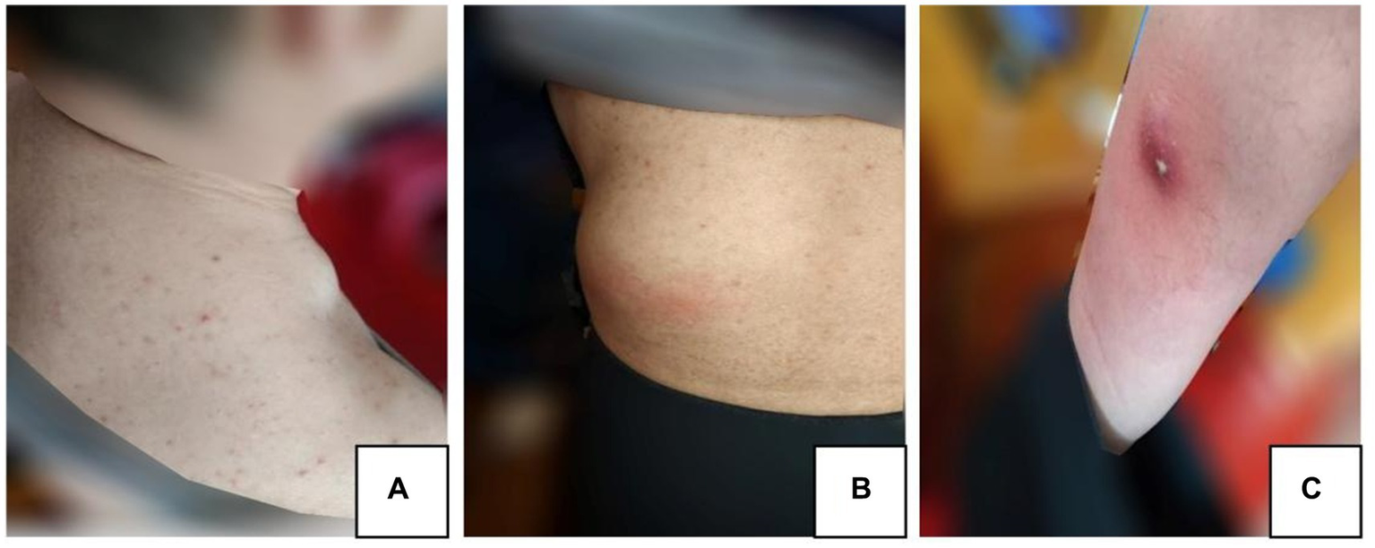In the present case, the patient showed many skin abscesses during steroids therapy. Together with Nocardia sequences, the sequences of human CMV were also detected in the abscess drainage fluid. Human CMV infection is a severe complication in immunocompromised patients. Skin manifestations of this infection are very rare; maculopapules are the main manifestation on the skin, and ulcers, blisters, erosion, plaques, and nodules may also appear (32, 33). The probability of skin abscesses is very low, and most of the lesions are located in the perianal, genital, and the surrounding areas (34). This patient showed no skin rash, ulcer, blisters, or other manifestations, and the abscesses were distributed in the neck, lumbar region, and anterior tibia. Because the number of sequences of Nocardia in the skin abscess drainage fluid was significantly higher than that of human CMV, Nocardia infection was consider the cause of abscess. Nocardiosis is a rare disease caused by Nocardia, which occurs as respiratory or skin infections; most patients have lung infections, followed by central nervous system and skin infections (35). It often occurs in immunodeficient patients (HIV infection, etc.) or immunocompromised patients (long-term use of glucocorticoids, malignant tumors, diabetes, etc.). The lung CT findings of the patient were normal, and there was no manifestation of central nervous system infection; thus, the diagnosis was confirmed as nocardiosis dermatitis. The cause of infection with this bacterial species is considered to be related to the patient’s history of nephritis, treatment with glucocorticoids, and low immunity. Sulfonamides are the primary first-line treatment agents for nocardiosis, and trimethoprim-sulfamethoxazole (TMP-SMX) is the most widely used sulfonamide (36). The patient’s condition improved after receiving treatment for nocardiosis, including puncture, drainage, and compound sulfamethoxazole. When the first medication is ineffective, combination therapy—such as amikacin and TMP-SMX, imipenem and TMP-SMX, or amikacin and cefotaxime—is frequently used (36, 37). Interferon, a new class of medication that is currently being used to treat refractory disseminated Nocardia infection, functions primarily by inducing several antibacterial effects and by inhibiting the intracellular growth of pathogens. Although it has a good therapeutic effect, it is rarely used in clinical practice because of several negative side effects (38).