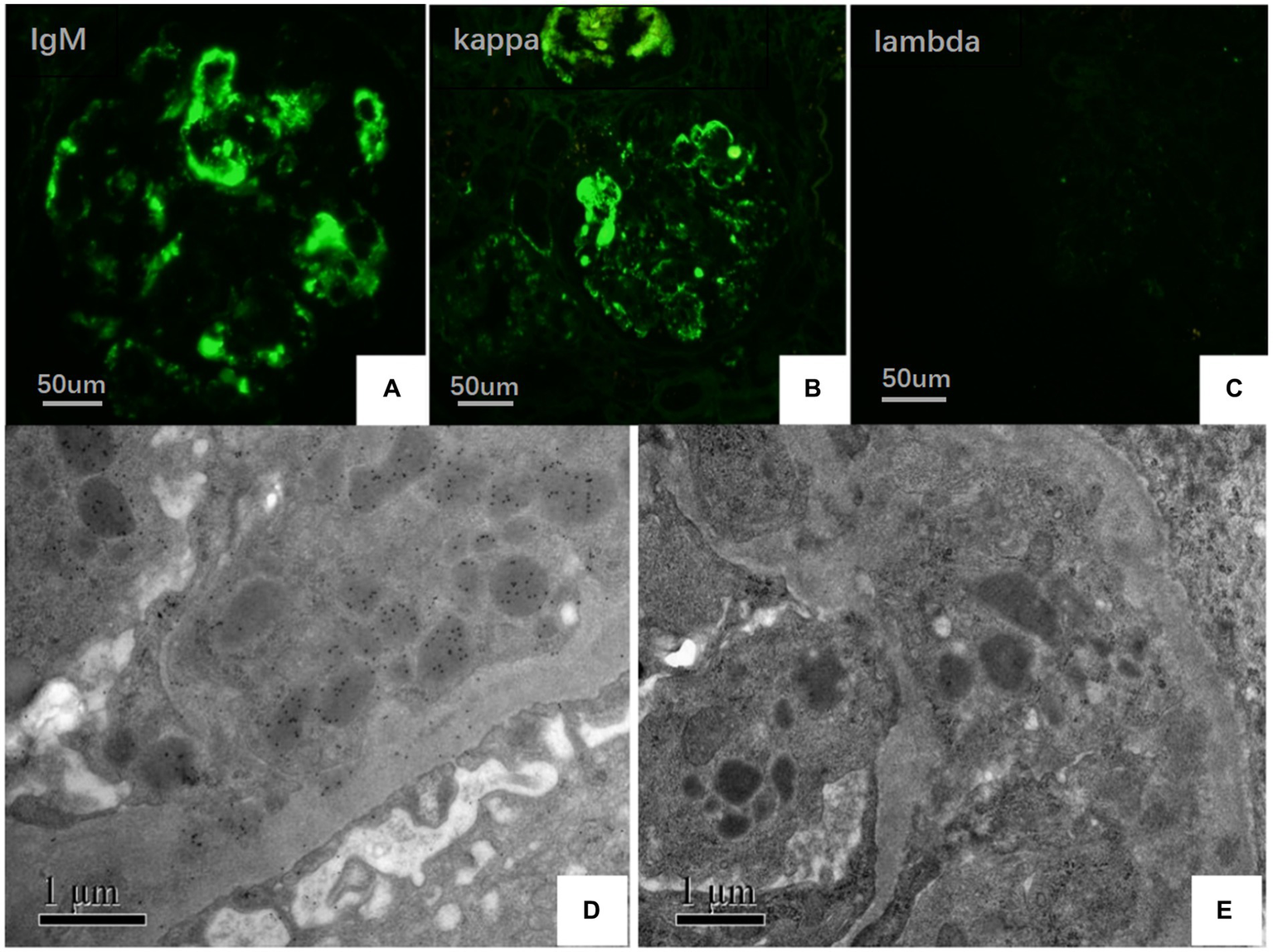 (A–C) Under IF, IgM and kappa light chain were deposited in mesangial area and vascular loops (green), where lambda light chain was negative (FITC direct immunofluorescence:magnification ×400). (D) Electron microscopy showed kappa light chain (++ to +++) in glomerular subendothelial and subepithelial deposition. (E) Electron microscopy shows lambda light chain (±).
