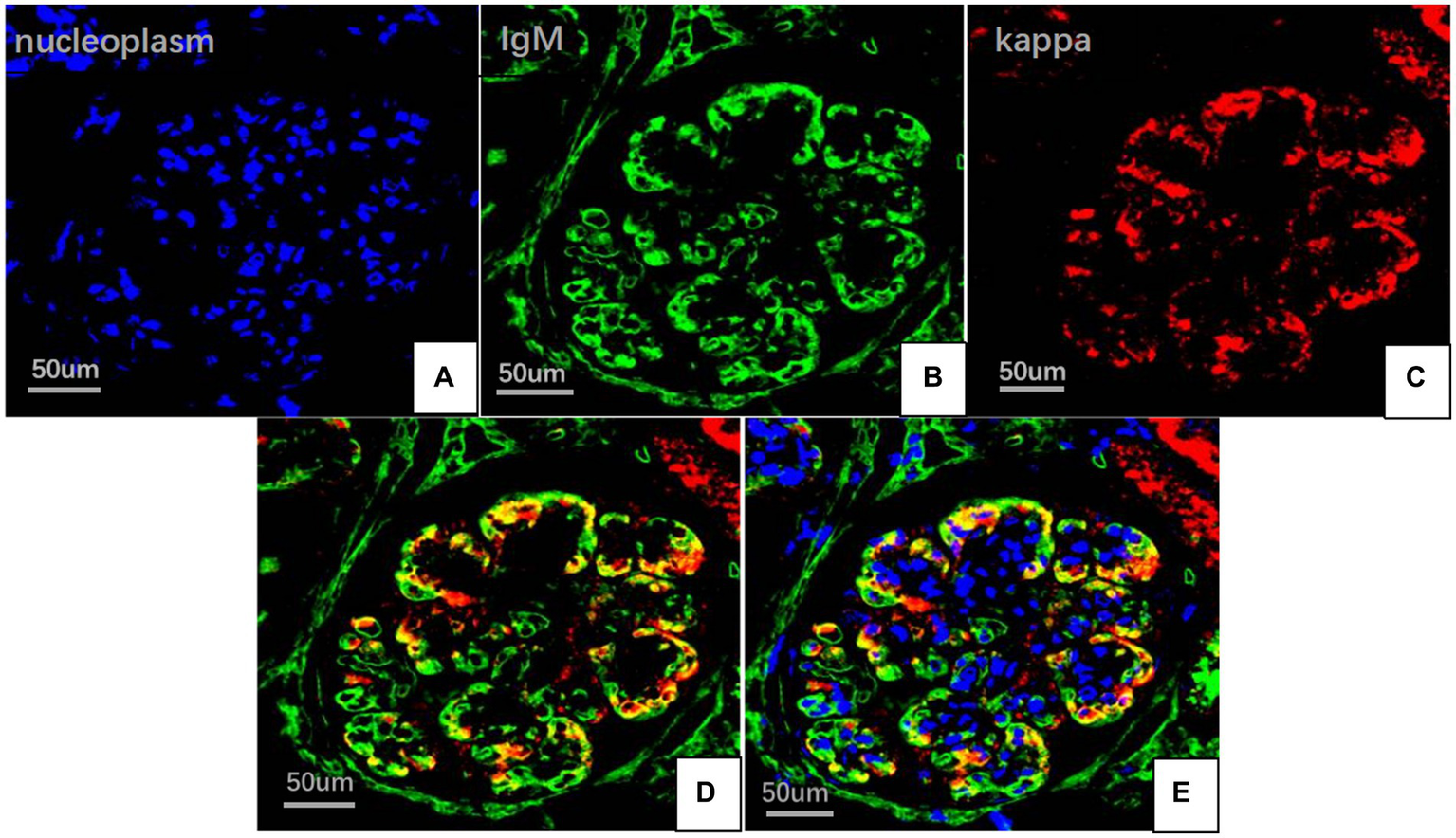Multiplex immune fuorescence staining of glomerular (FITC indirect immunofluorescence:magnification ×400). (A) Nucleoplasm (blue). (B) IgM light chainstaining (green). (C) Kappa light chain (red). (D) IgM and kappa light chain. (E) IgM, kappa light chain and nucleoplasm.