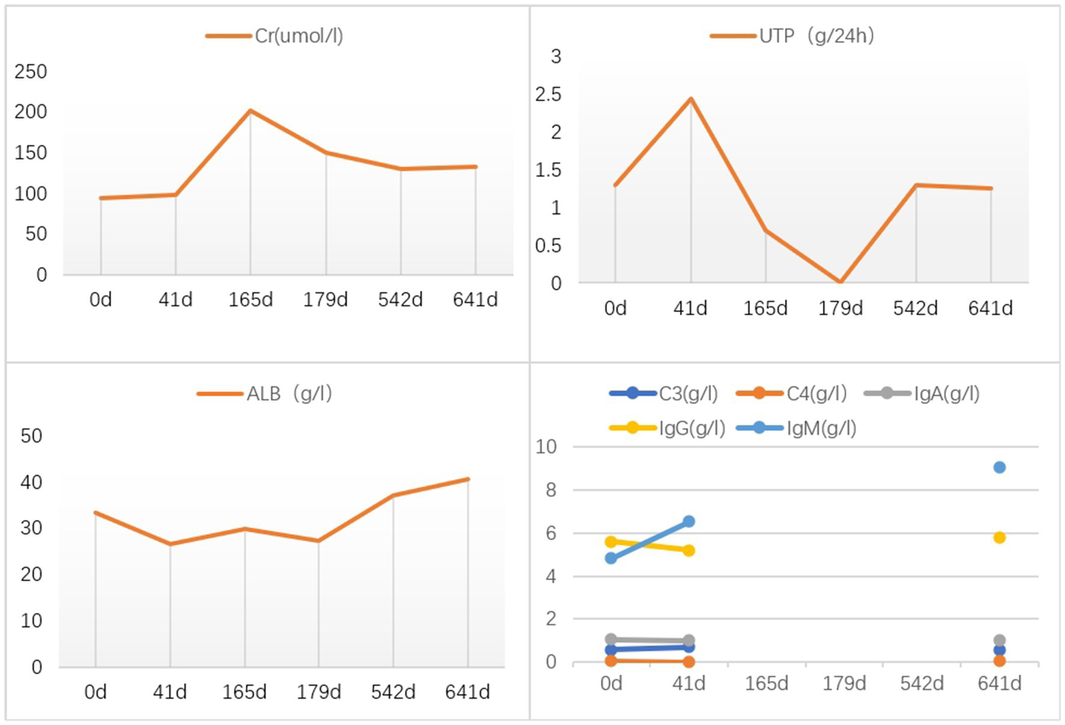 Clinical course of the patient after admission. Creatinine (Cr); 24 h urinary protein quantification (UTP); serum albumin (ALB); complement 3 (C3); complement 4 (C4); immunoglobin A (IgA); total immunoglobin G (IgG); immunoglobin M (IgM).