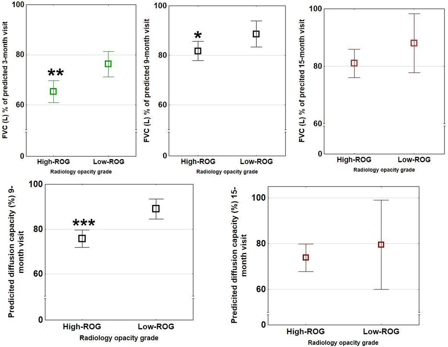 Relationship between radiology opacity score at the 10 months follow-up and predicted diffusion capacity at spirometry at the 9 months visit. Subjects with low-ROG (unfilled black dotted) with no/minor residual changes and high-ROG (unfilled dotted) with more widespread changes are shown. A significant relationship was found (r = −0.48, p < 0.001, non-parametric Spearman rank test).