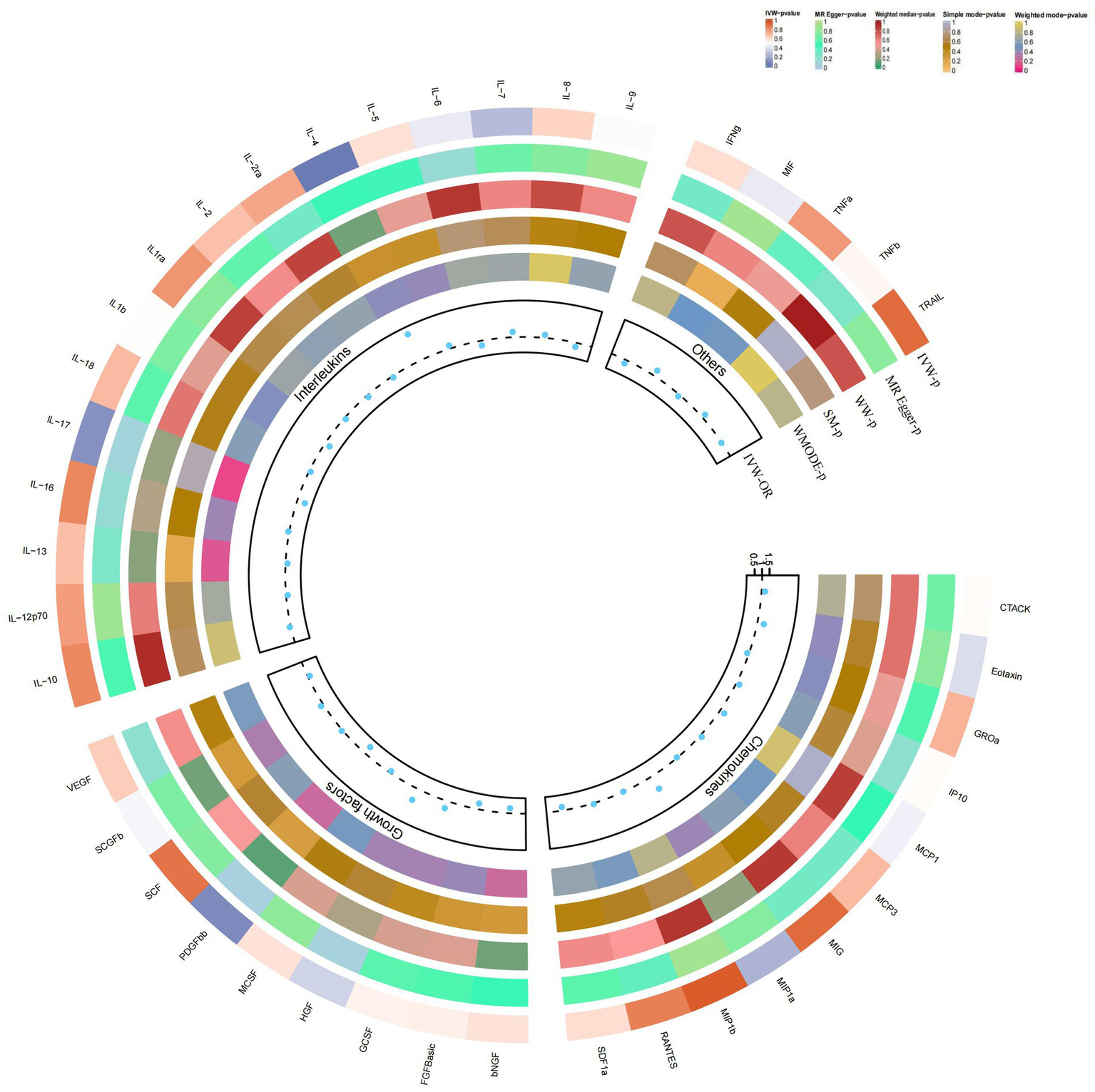 Inflammatory factors play a pivotal role in the development of autoimmune dermatoses. Abnormal activation of the immune system triggers the accumulation of immune cells and the release of inflammatory factors. The release of these inflammatory mediators initiates a persistent inflammatory response, leading to abnormal changes in the skin tissue, including abnormal keratinization, impaired epidermal barrier function, and vasodilation (17, 23). This vicious cycle further stimulates the release of immune cells and inflammatory factors, exacerbating the persistence of chronic inflammation. In this study, we employed MR analysis methods to investigate the potential role of circulating cytokines in the risk of developing these diseases, focusing specifically on the causal relationship between circulating cytokines and atopic dermatitis, psoriasis, and vitiligo.