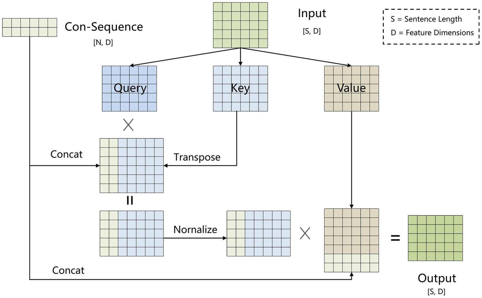 All electronic medical record text data in this paper is from the same hospital and contains entities and relations related to VTE, so common features exist among the data. To capture these common features, we propose an improved self-attention mechanism that allows the neural network to capture long-term dependencies by computing correlations between every two positions in the text while also capturing additional common features of the electronic medical record text. Figure 5 illustrates the improved self-attention structure where we establish an input-independent learning matrix jointly trained by all input data. The matrix captures common features of the input data and is added to the self-attention mechanism for operation.