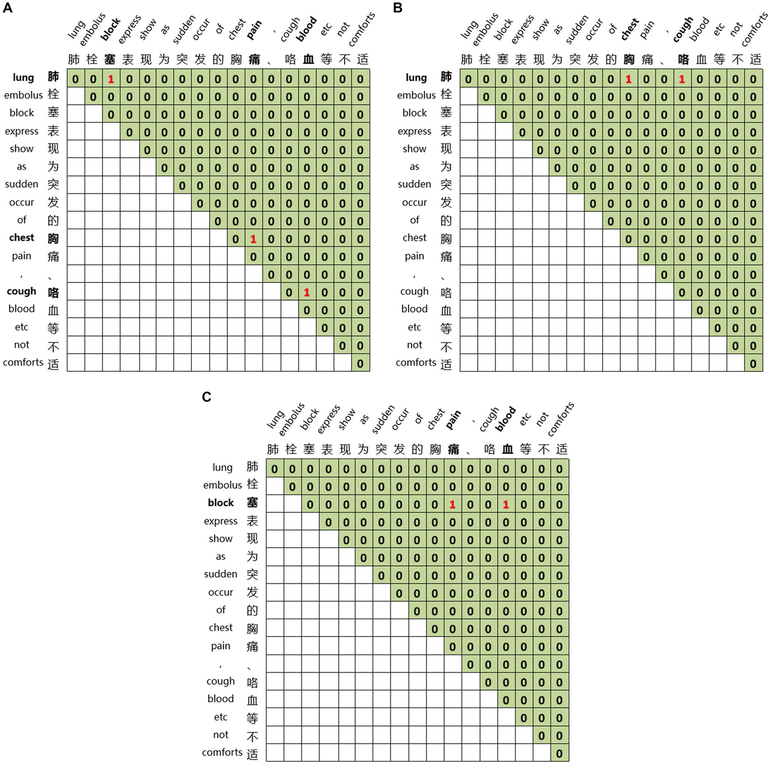Global matrices are employed for joint entity and relation extraction. We construct three global matrices for an input sequence to indicate the links between entity head and entity tail, subject head and object head, subject tail and object tail, respectively. For the sentence ‘Pulmonary embolism is characterized by sudden onset of chest pain, hemoptysis, and other discomforts’ we construct three matrices, as illustrated in Figure 6. Figure 6A represents the link between the head and tail of the entities through which the three entities of pulmonary embolism, chest pain, and hemoptysis can be identified. Figure 6B displays the link between the subject’s head and the objects’ head, revealing the relations between entities with specific head characteristics. The relation between the entity with ‘肺’ as the head of the entity and the entity with ‘胸’ as the head of the entity, and the entity with ‘肺’ as the head of the entity and the entity with ‘咳’ as the head of the entity can be learned from Figure 6B. Figure 6C demonstrates the link between the subject’s tail and the objects’ tail, revealing the relations between entities with particular tail features. We can learn from Figure 6C that the relation between the entity with ‘塞’ as the tail of the entity and the entity with ‘痛’ as the tail of the entity, and the entity with ‘塞’ as the tail of the entity and the entity with ‘血’ as the tail of the entity. By combining Figures 6B,C, we can learn the relations between pulmonary embolism and chest pain and pulmonary embolism and hemoptysis, with pulmonary embolism as the subject and chest pain and hemoptysis as the objects. This joint extraction method for entities and relations achieves simultaneous extraction while avoiding error propagation.