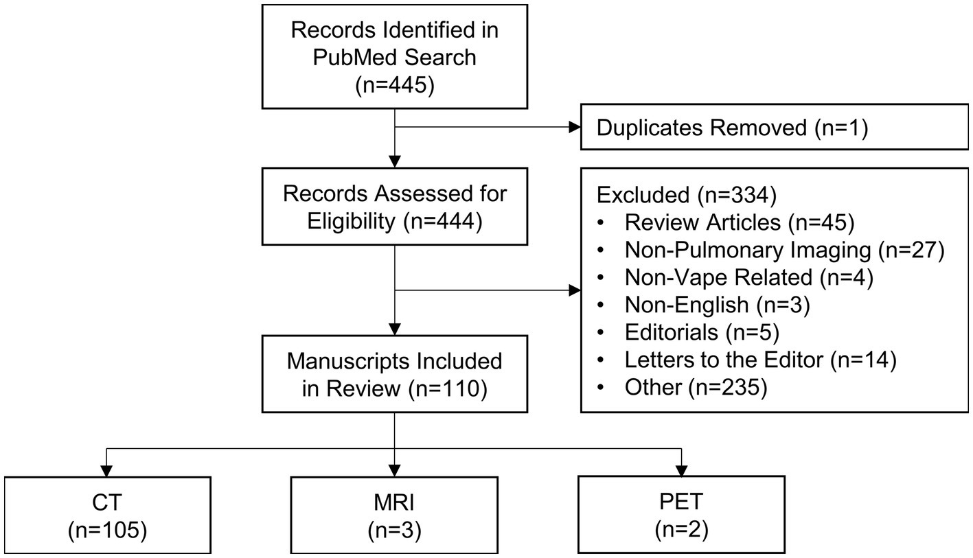 The search identified 445 manuscripts, of which 110 (668 unique participants) specifically mentioned MRI, PET or CT imaging in cases or retrospective case series of patients who vaped. This included 105 manuscripts specific to CT (626 participants), three manuscripts which mainly used MRI (23 participants), and two manuscripts which described PET findings (20 participants). Most studies were conducted in North America (n = 90), with the remaining studies conducted in Europe (n = 15), Asia (n = 4) and South America (n = 1). The vast majority of publications described case studies (n = 93) and a few described larger retrospective or prospective studies (n = 17). In e-cigarette users and patients with EVALI, key CT findings included ground-glass opacities, consolidations and subpleural sparing, MRI revealed abnormal ventilation, perfusion and ventilation/perfusion matching, while PET showed evidence of pulmonary inflammation.