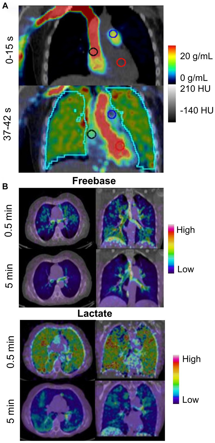 PET is a quantitative molecular imaging modality that utilizes radiotracers to measure pulmonary ventilation, perfusion and blood flow as well as metabolic activity. The radiotracers used in PET imaging emit positrons, which will typically travel a few millimeters before colliding with an electron in the surrounding tissue, resulting in the emission of two 511 keV photons in opposite directions that are then detected by PET detectors oriented around the patient. In the context of lung disease, PET imaging is mostly commonly used to detect cancerous cells. However, PET radiotracers may also be used to evaluate the deposition of inhaled substances using carbon-11 (11C) and fluorine-18 (18F) (62), inflammation using 18F-fluorodeoxyglucose (18F-FDG) (63) and ventilation using nitrogen-13 (13N2) (63).