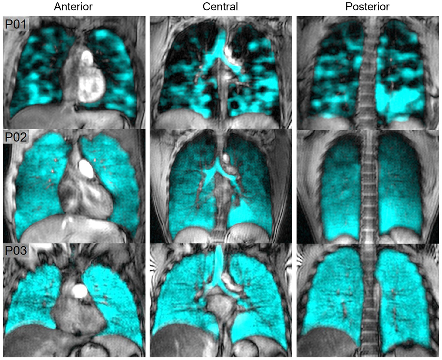 Hyperpolarized noble gas, oxygen-enhanced 1H, free-breathing 1H and arterial spin labelling methods are employed in order to acquire pulmonary functional MR images. These MRI techniques, in combination, may be used to measure lung ventilation and/or perfusion (64, 65), and are sensitive to early disease changes not easily detected with conventional pulmonary function tests (64, 66).