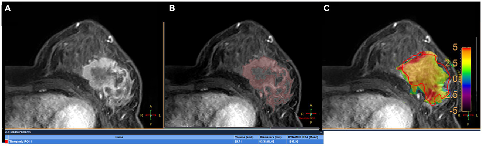 All images were analyzed with the IntelliSpace Portal (ISP, Philips Healthcare, Cleveland, OH, United States) workstation. The magnetization transfer ratio with asymmetric analysis at +3.5 ppm (MTRasym [+3.5 ppm]) for each image voxel was carried out to generate APTw maps from raw images in real time on the console with Z-spectrum fitting and B0 correction (14), where values in the maps refer to differences between the signal intensities at ±3.5 ppm of water proton resonance, as percentages of the signal intensities when the saturation pulse applied is far off resonance. Image analysis was carried out by two breast radiologists (readers 1 and 2 with 13 and 6 years of experience in imaging diagnosis, respectively, blinded to final pathological results and other clinical data). In each patient, APTw maps were firstly fused onto DCE images at approximately the same slice position (22), and a 2D region of interest (ROI) was delineated on the slice transecting the largest area of the lesion. The ROIs included the most enhanced lesion regions on DCE images while avoiding cystic or necrotic lesions (Figure 2A). The maximum diameter (Dmax) and 3D volume (V) of each tumor were measured on DCE images. The threshold extraction method of the MR Segmentation software on the workstation (Intellispace Portal v7.0, Philips Healthcare) was used to extract the tumor as a whole, and the software automatically yielded Dmax and V (Figures 2B,C). Apparent diffusion coefficient (ADC) values were measured on DWI images. APTw, V, Dmax and ADC values at the time points T0 and T1 were annotated as APTw0, APTw1, V0, V1, Dmax0, Dmax1, ADC0 and ADC1, and changes in APTw, V, Dmax and ADC values at T1 relative to T0 were termed ΔAPTw, ΔV, ΔDmax and ΔADC, respectively.