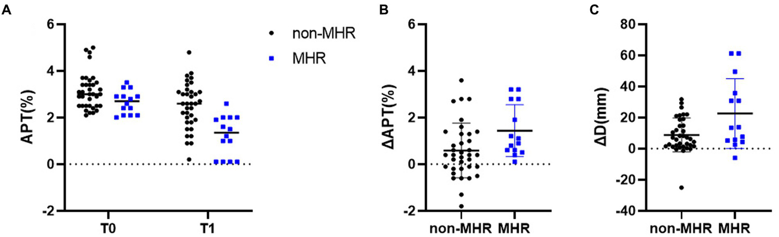 About 37% of patients exhibit no benefits from NAC (3). Early and accurate prediction of tumor response to NAC is critical for treatment management. Studies have revealed the MHR status or minimal residual disease as the best predictor of good long-term prognosis (30, 31). As the gold standard for evaluating tumor response, pathological examination has high diagnostic accuracy, but must be performed after surgery, making it easy to miss the best opportunity for treatment adjustment. Therefore, it is necessary to develop tools that could dynamically assess tumor response to NAC in vivo. Due to elevated hemoglobin and albumin concentrations, angiogenesis may increase protein signaling in malignant tumors (16, 29), indicating NAC-induced angionecrosis may potentially be examined by APTw. Dula et al. (16) evaluated only one patient by pCR status, whose APTw value decreased from 4.86 ± 0.15% to 3.5 ± 1.59% after 1 cycle of NAC. In this study, APTw values of MHR in 50 breast cancer patients significantly lower than non-MHR before NAC, and early after chemotherapy (2 cycles) were compared and it was found that APTw values in the MHR group decreased significantly after NAC, with a more pronounced reduction than in the non-MHR group. This observation corroborated a study by Zhang et al. (32) in which APTw values after NAC were significantly different from baseline in the MHR group (3.19% vs. 2.43%; p = 0.03), while there was no difference in the non-MHR group (2.76% vs. 2.50%, p > 0.05). These results indicate that NAC reduces mobile protein concentrations in MHR and non-MHR patients in early treatment, reflecting reduced protein expression in breast cancer cells stressed by NAC. Importantly, NAC-induced decrease in APTw value was not due to treatment-induced changes in tumor acidosis. In aggressive tumors, glycolysis upregulation is common, resulting in acidic tumors (33). The chemical exchange of amide protons with water is base-catalyzed; therefore, acidic tumors have low APTw values, which may be increased by therapies reducing glycolytic metabolism. We observed no increase in APTw in response to NAC, suggesting NAC-induced decrease in APTw is due to decreased mobile protein content rather than reduced glycolytic metabolism and tumor acidity. This finding corroborated a previous study (34).