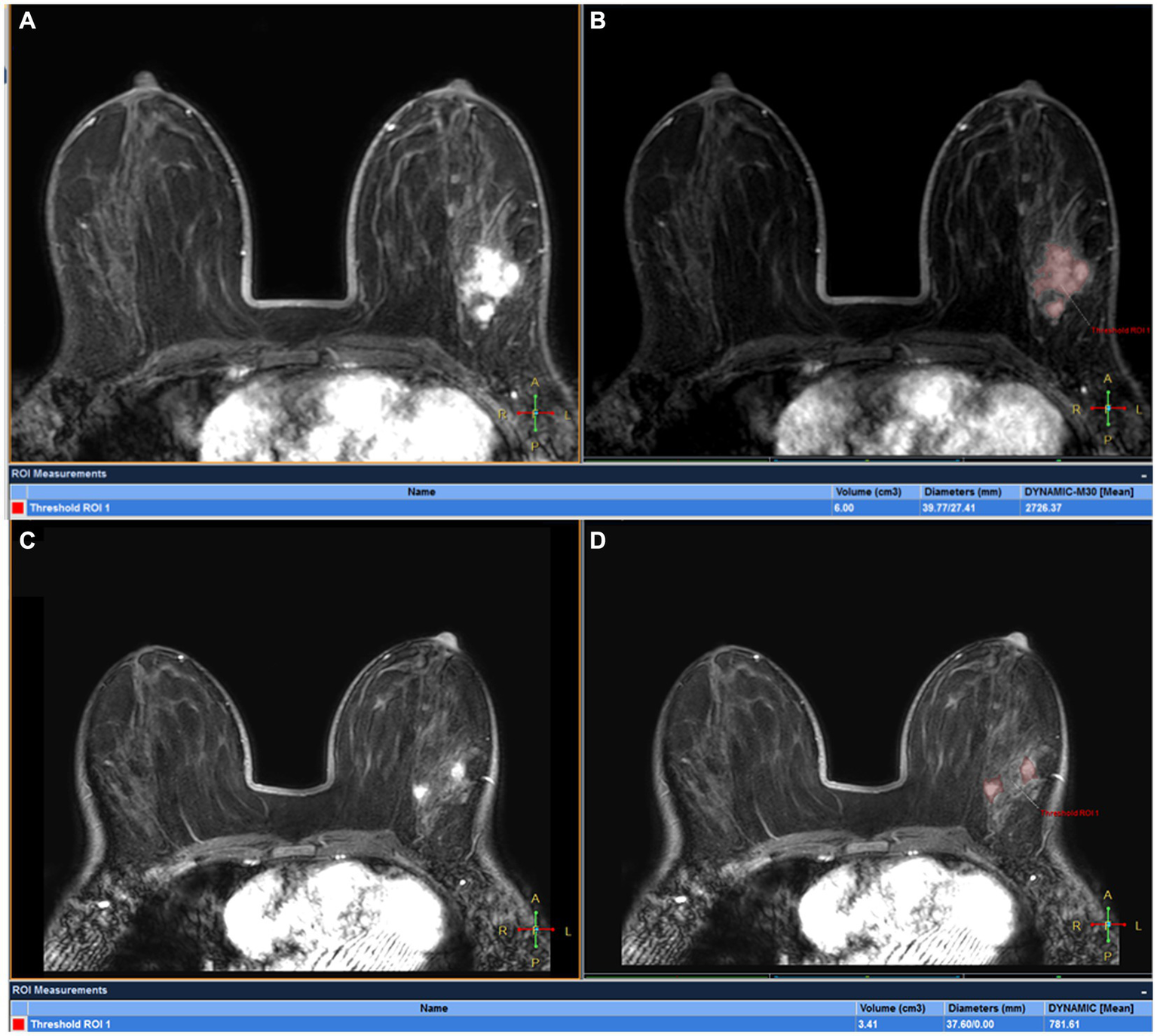 Figure 5. DCE-MRI of a 32-year-old woman with left ER+ invasive breast cancer at T0 (A,B) and T1 (C,D): tumor maxmium diameter meausred at T0 (Dmax0) and T1 (Dmax1) were 39.77 and 37.60 mm, respectively and tumor volume meausred at T0(V0) and T1(V1) were 6.00 cm3 and 3.41 cm3, respectively. The patient was confirmed by pathological analysis of the surgical specimen collected after first 2 cycles of NAC as having pCR.