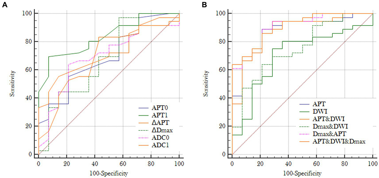 Figure 6. (A) Receiver operating characteristic curves for individual imaging parameters obtained at T0 or T1: AUC (APT0) = 0.690, AUC (ADC0) = 0.694, AUC (APT1) = 0.837, AUC (ΔAPTw) = 0.723, AUC (ΔDmax) = 0.685 and AUC (ADC1) = 0.692; (B) Receiver operating characteristic curves for different combinations of imaging paramenters: AUC (APT) = 0.879, AUC (DWI) = 0.704, AUC (Dmax+DWI) = 0.752, AUC (Dmax+APTw) = 0.903, AUC (APTw+DWI) = AUC (Dmax+DWI + APTw) = 0.904 (APT = APT0 + APT1 + ΔAPT; DWI = ADC0 + ADC1).