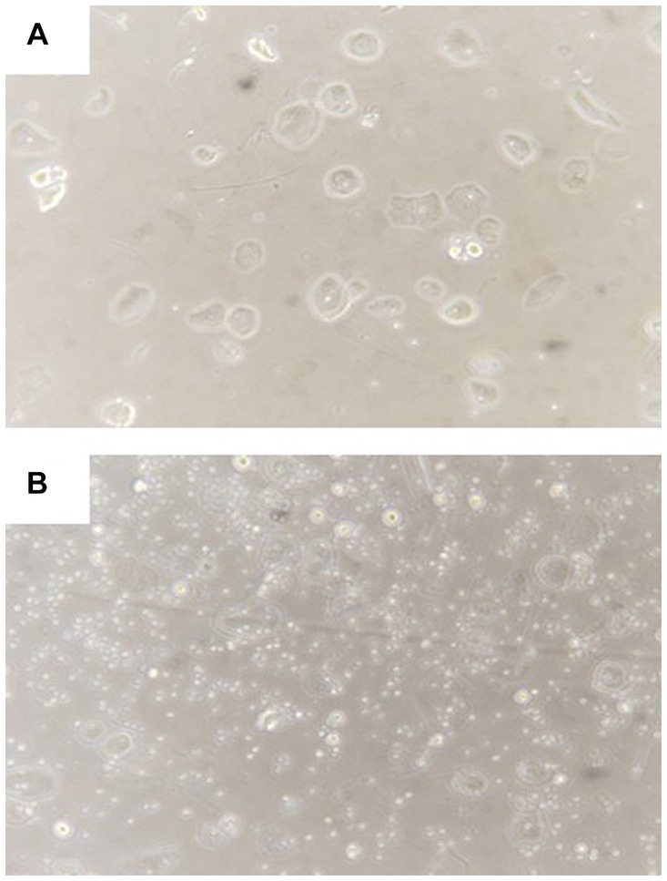 Representative morphology of amniotic fluid cells before (A) and after (B) culture for 2 h. Visible expansion of small round stem cells after culture.