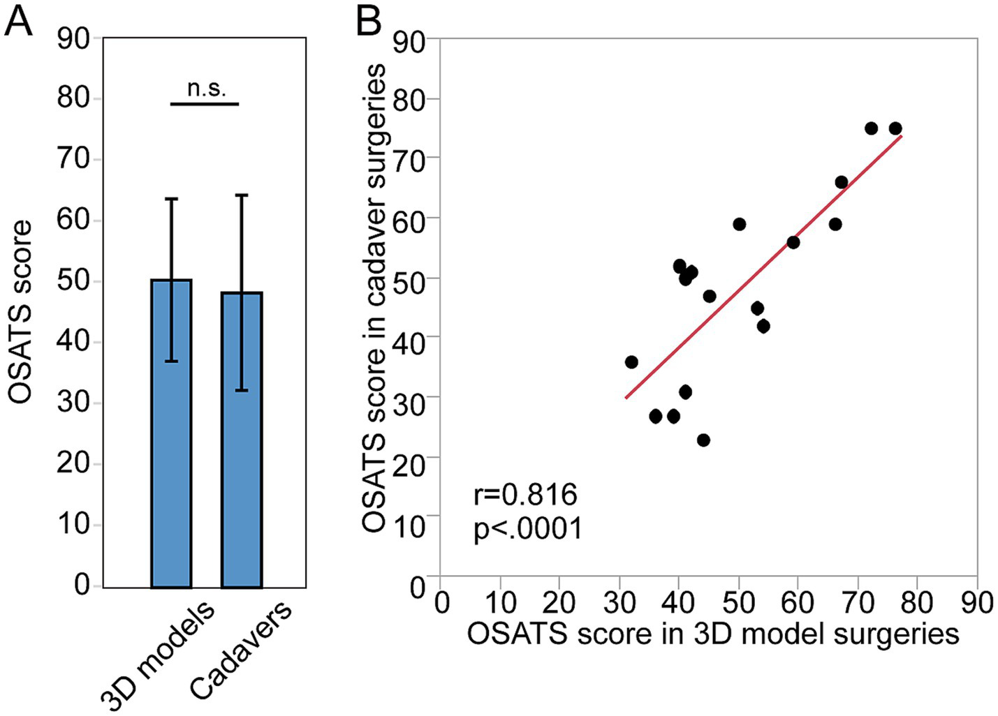 A total of 17 surgeries for 3D models and their paired surgeries for cadavers were assessed (Table 2). The OSATS score in 3D models and cadaver was 50.41 ± 13.31 and 48.29 ± 16.01, respectively (Table 2; Figure 2A). There was no significant difference between them (p = 0.36). There was significant positive correlation between OSATS score in 3D models and cadaver (r = 0.82, p < 0.0001, Figure 2B).