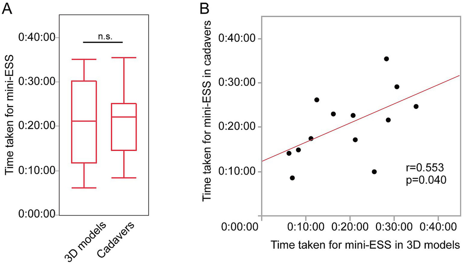 There were no significant differences in spending time for a mini-ESS (3D models 21:29 ± 0:10 and cadavers 20:33 ± 0:07, p = 0.53, Figure 4A). The time taken to complete a mini-ESS in 3D models were significantly positively correlated to the time taken in cadavers (a mini-ESS r = 0.553, p = 0.0402, Figure 4B).