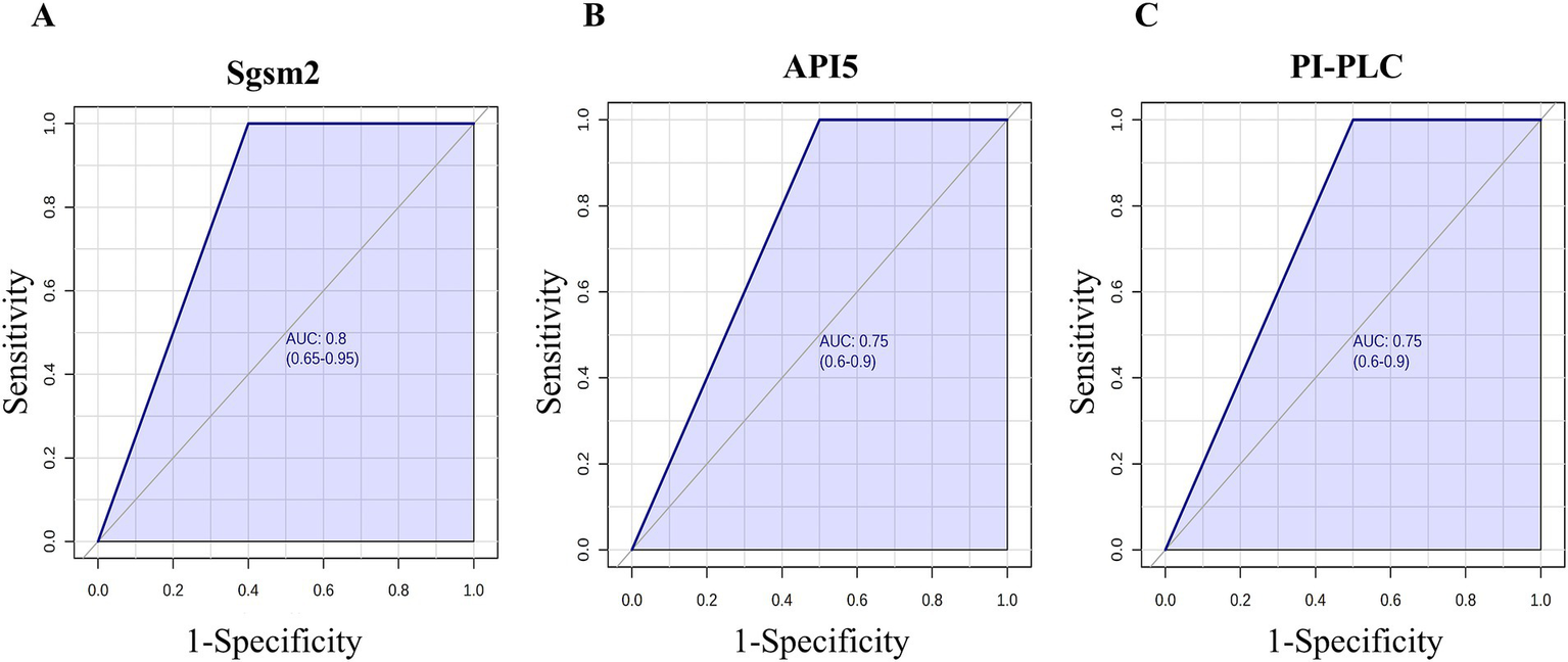 ROC curve of the three main proteins in salivary proteome (A) Sgsm2, (B) API5, and (C) PI-PLC.