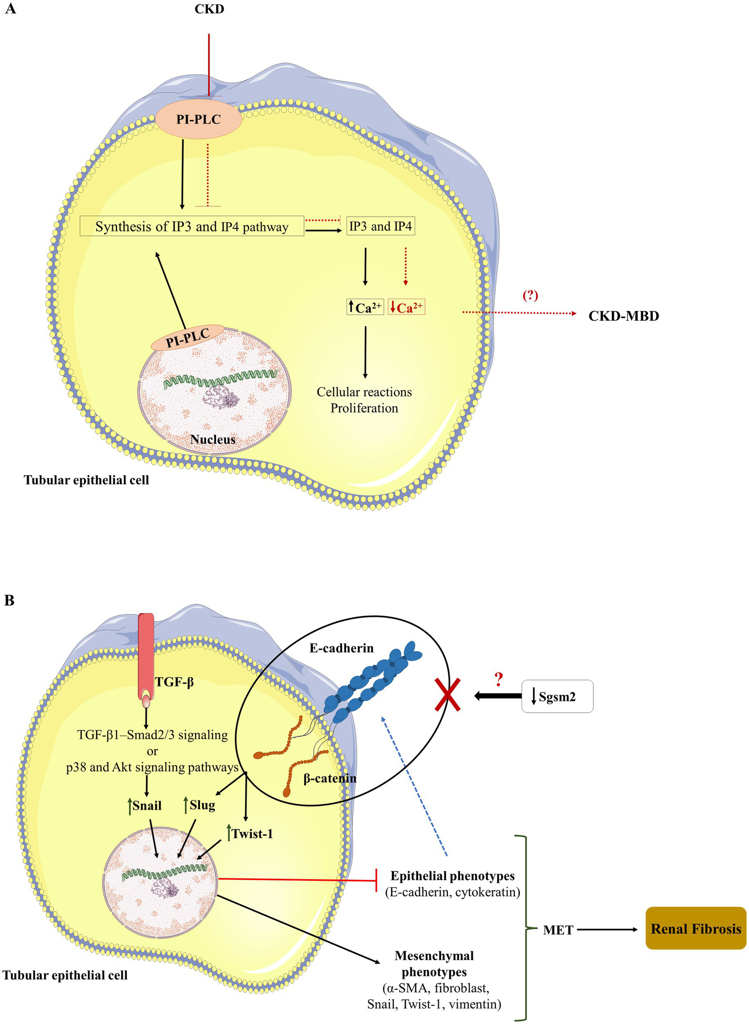 (A) The figure shows the PI-PLC protein, which participates in the IP3 and IP4 synthesis pathways and mobilizes calcium to regulate cell reactions and proliferation requiring free calcium. This study showed that the presence of CKD inhibited PI-PLC expression. As a result, the IP3 and IP4 synthesis signaling pathway is impaired, decreasing or inhibiting the expression of IP3 and IP4 decreasing the mobilization of intracellular calcium. It is hypothesized that this dysregulation of calcium mobilization may progress to CKD-MBD (arrows in red show pathway advancement from the CKD patient hypothesis). (B) The figure shows the increased expression of transcription factors such as Snail from the activation of TFG-β receptor-dependent pathways (TGF-β1-Smad2/3 and p38 and Akt), which lead to decreased epithelial phenotypes and increased mesenchymal phenotypes. When there is a decrease or no expression of epithelial markers, there is an increase in the expression of transcription factors, such as Slug and Twist-1, which also lead to the inhibition of the epithelial phenotype and increase of the mesenchymal phenotype. This change in the phenotypic profile promotes the epithelial–mesenchymal transition, which leads to renal fibrosis. This study showed that patients with CKD did not express the Sgsm2 protein, and the hypothesis is that the absence of this protein leads to a decrease in the expression of E-cadherin and b-catenin, increasing the expression of mesenchymal markers and decreasing epithelial markers favoring EMT and, consequently, increasing renal fibrosis.