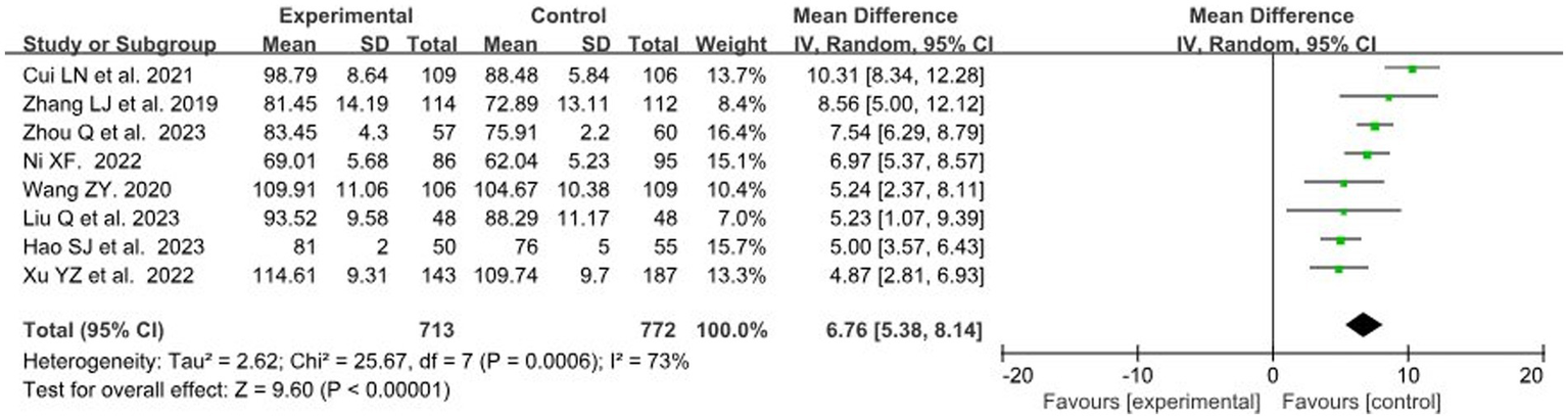 A total of 8 studies (29, 31–34, 37, 39, 40) with data related to self-learning ability score were included, involving 824 and 882 students in the BOPPPS group and traditional teaching group, respectively. In this meta-analysis, the overall effect size of the 8 studies (MD = 6.76, 95% CI: 5.38–8.14, Z = 9.60, p < 0.00001) indicated a significantly higher self-learning ability score in the BOPPPS teaching group compared to the traditional teaching group. Due to moderate statistical heterogeneity among the studies (p = 0.0006, I2 = 73 > 50%), a random-effects model was used for the meta-analysis (Figure 5).