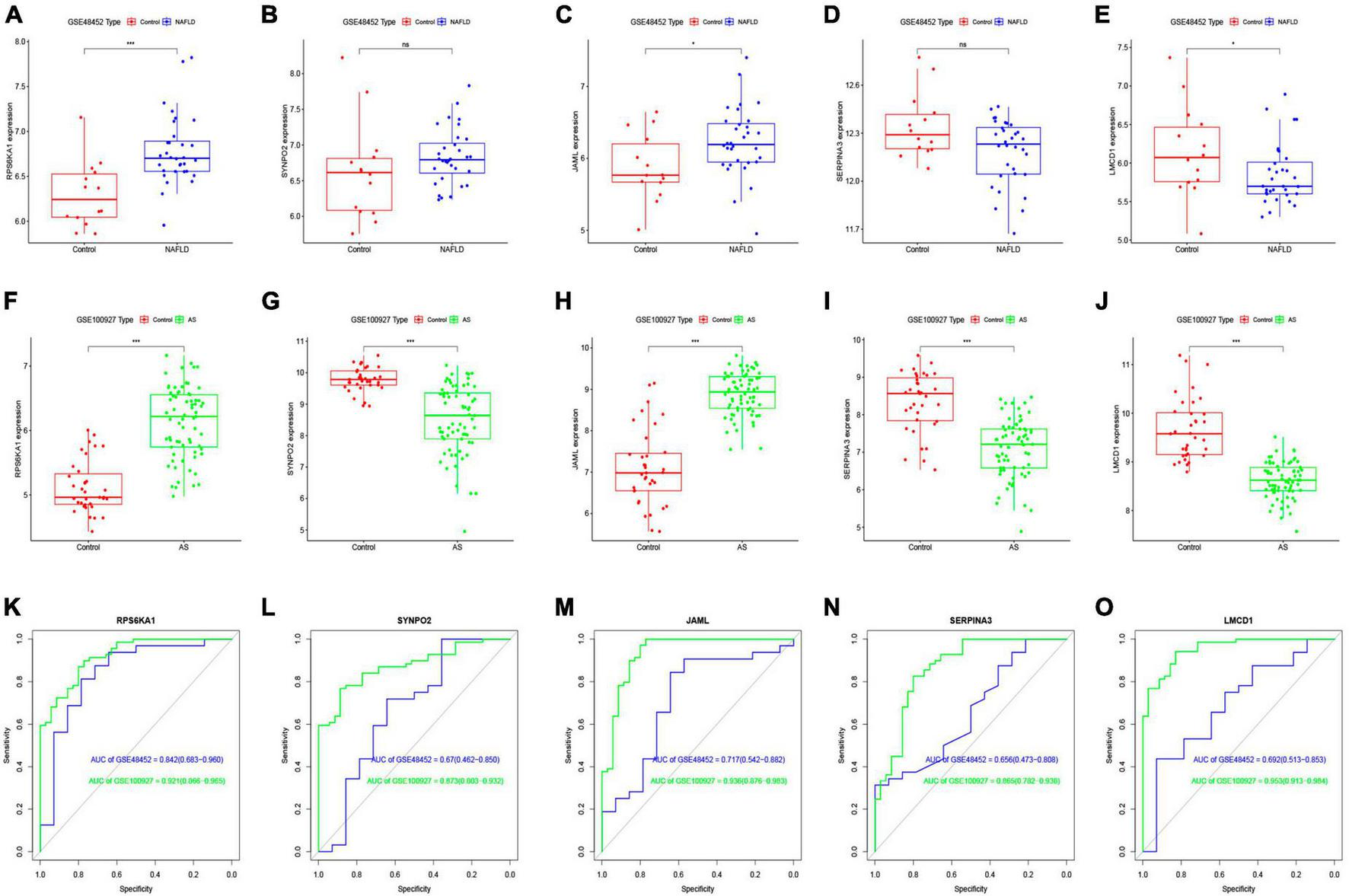Differential expression analysis of core genes and ROC curves. Differential expression of core genes between control and NAFLD in GSE48452 (A–E) and between control and AS in GSE100927 (F-J). ROC curves of core genes in GSE48452 and GSE100927 (K-O). *P < 0.05 and ***P < 0.001. ns indicates not significant (p > 0.05).