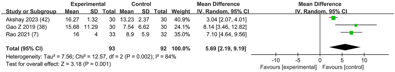 Some trials lacked enough details to fully evaluate the risk of bias; when full details allowing the exclusion of selection, performance, and detection biases were not reported, we classified these trials as having “some concerns.” The risk of bias for the 13 studies is presented in Figure 2A. Overall, the included studies were categorized as follows: six studies (46.2%) with low risk and seven studies (53.8%) with some risk (Figure 2B). Specifically, two studies exhibited some risk in the randomization process domain due to a lack of information on the randomization sequence and allocation concealment. Additionally, six studies showed some risk in the outcome measurement domain, as there was no clarity on whether outcome assessors were aware of the interventions received by participants. Other domains were deemed to have low risk.