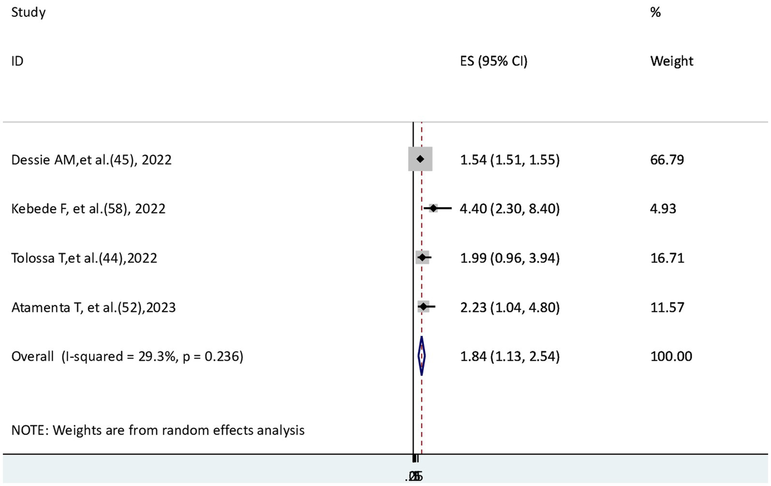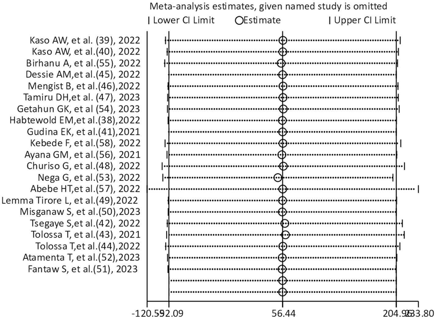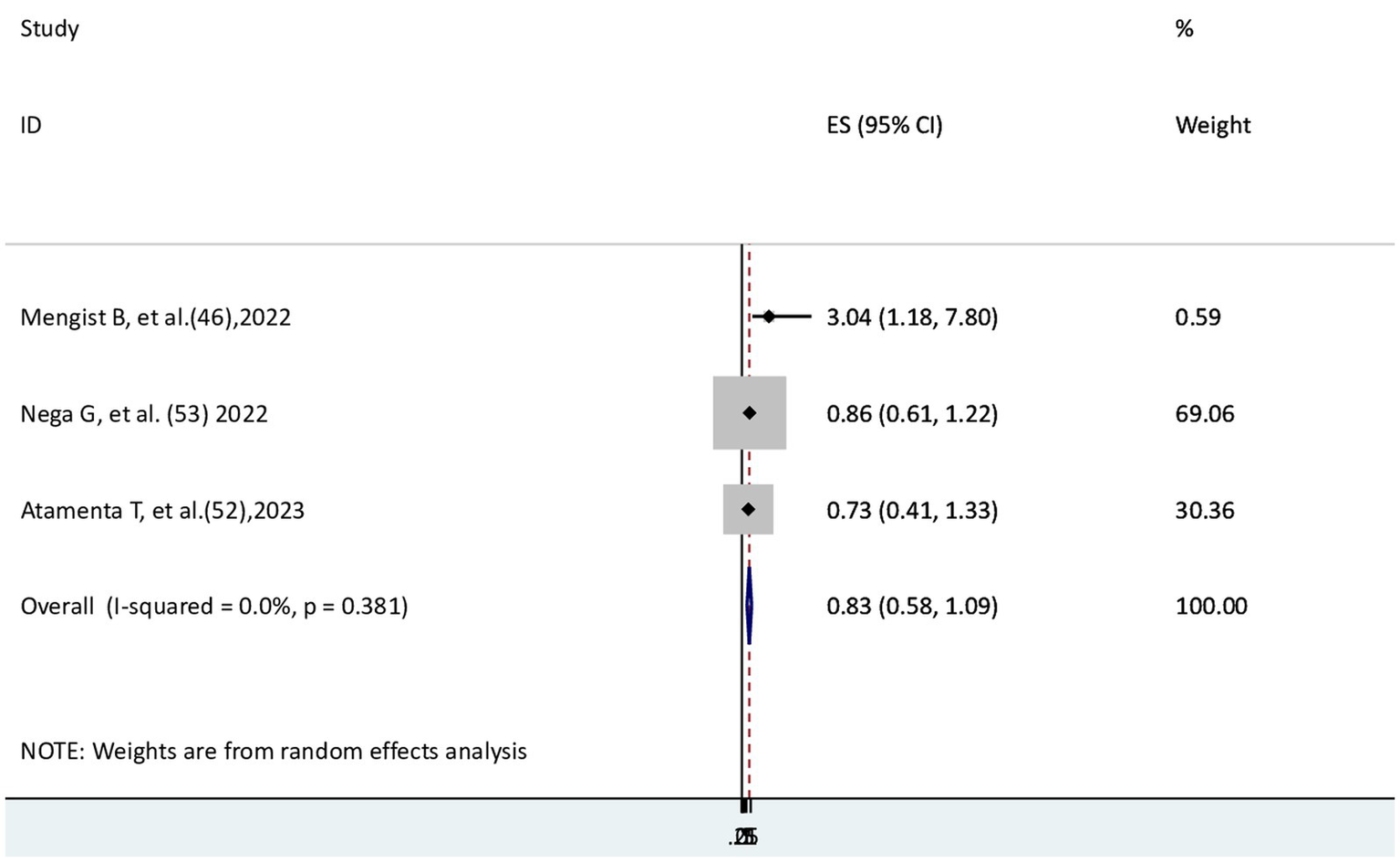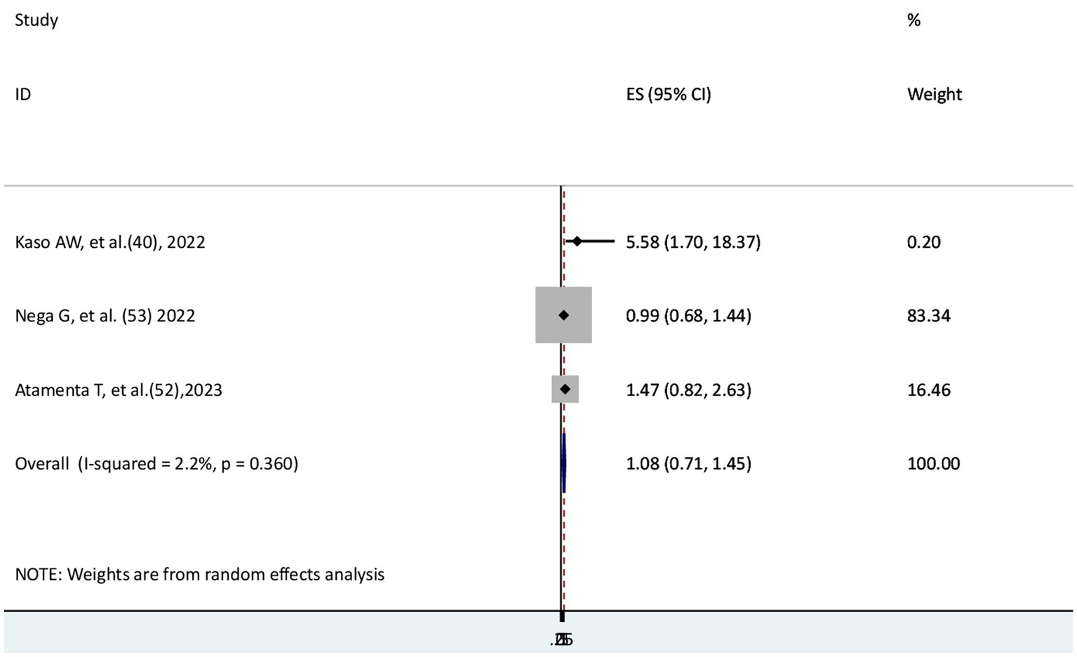 The main electronic databases searched were PubMed, CINAHL, Google Scholar, and African journals online. The included studies’ qualities were assessed independently using the Newcastle-Ottawa scale. The data was extracted in Microsoft Excel spreadsheet format. The pooled effect size and odds ratios with 95% confidence intervals across studies were determined using the random-effects model. I2 is used to estimate the percentage of overall variation across studies due to heterogeneity. Egger’s test and funnel plot were used to find the published bias. A subgroup analysis was conducted. The effect of a single study on the overall estimation was determined by sensitivity analysis.