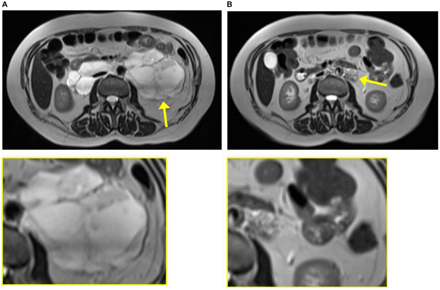 Magnetic resonance imaging from case 1 from 2020 at diagnosis of leiomyoma (A) and 2023 at diagnosis of lymphangioleiomyomatosis (B). The tumor is indicated by the yellow arrow and enlarged in the yellow box.