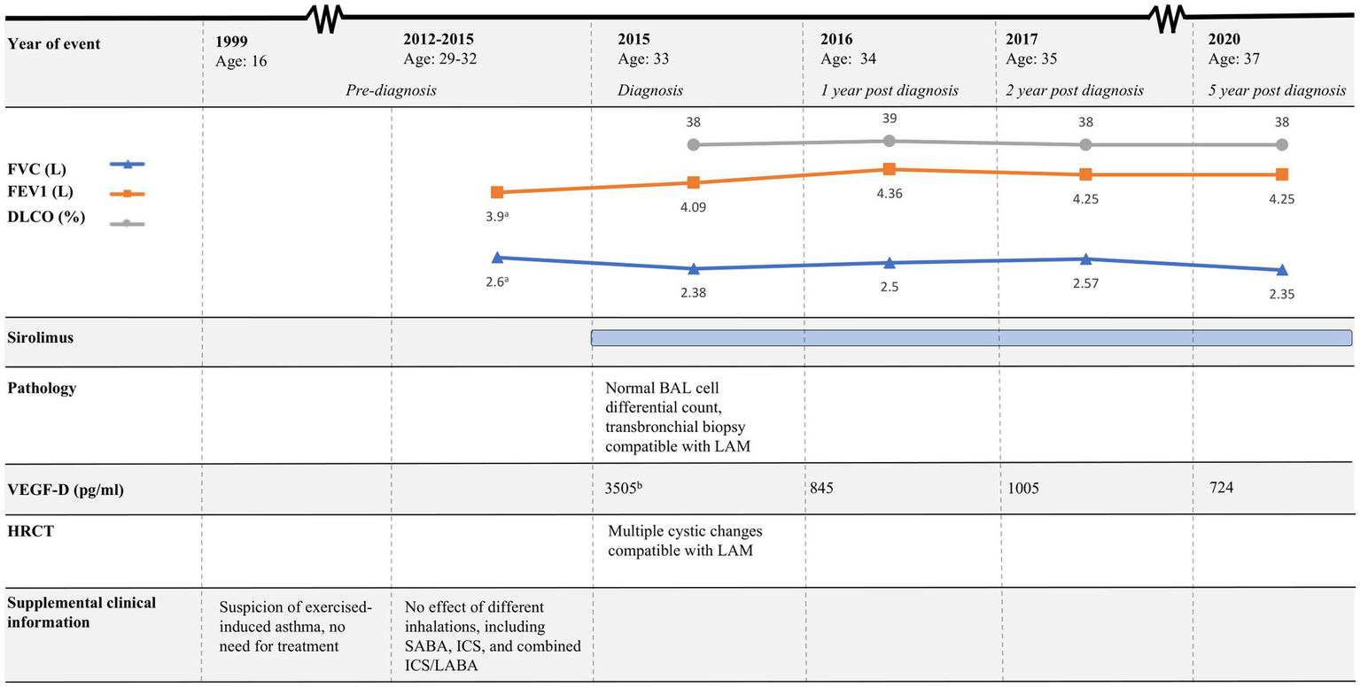 Timeline of case 2. HRCT, High-resolution computed tomography; FEV1, Forced expiratory volume in 1 s; FVC, Forced vital capacity; DLCO, Diffusion capacity for the lungs for carbon monoxide; LAM, Lymphangioleiomyomatosis; BAL, Bronchoalveolar lavage; SABA, Short-acting beta agonist; ICS, Inhaled corticosteroids; LABA, Long-acting beta-agonist. aPulmonary function tests performed in 2014. bResult from VEGF-D analysis was available 4 months after BAL was performed.