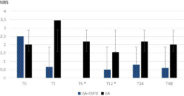 Finally, 12 h after surgery, the mean pain score at rest in the GA + ESPB vs. GA group was lower in both surgery approaches: TLIF approach was 1.54 ± 1.2 vs. 0.5 ± 066; p = 0.004 and in the TLIF+ALIF approach was 2 ± 1.2 vs. 0.25 ± 0.5; p = 0.015, respectively.