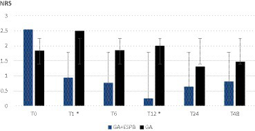 Pain score at rest between patients with general anesthesia with and without erector spinae plane block undergoing lumbar spinal fusion surgery with posterior transforaminal fusion approach. GA: general anesthesia; ESPB: erector spinae plane block; NRS: numeric rating scale; T0: before the surgery; T1: 1 h after the surgery; T6: 6 h after the surgery; T12: 12 h after the surgery; T24: 24 h after the surgery; T48: 48 h after the surgery; * – statistically significant difference.
