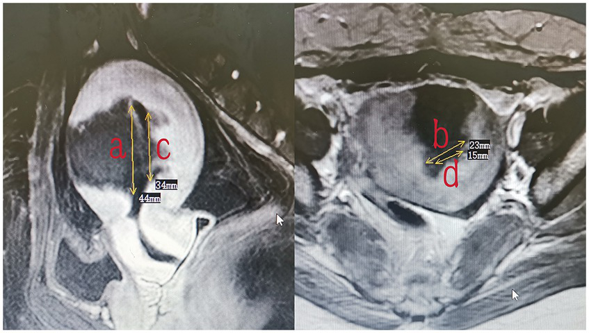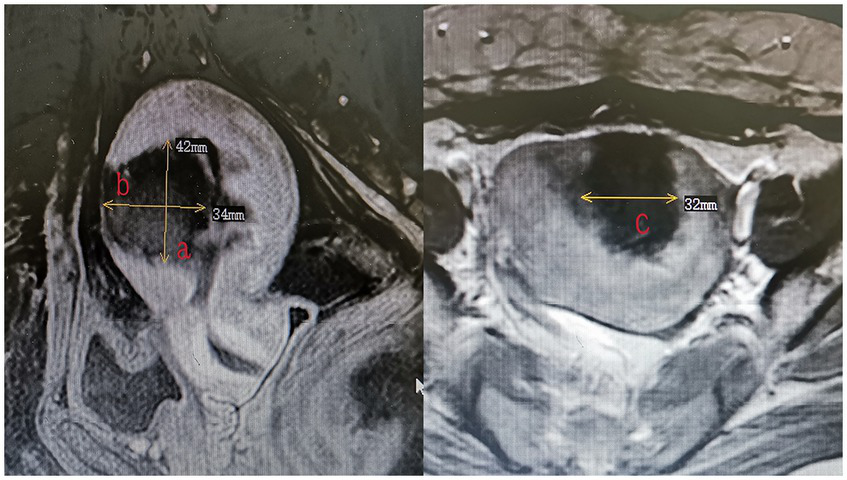 The measurement of the volume of adenomyotic lesions (volume = 0.5233 × a × b × c).