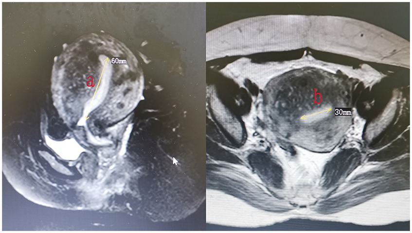 The endometrium of the uterine cavity is an inverted triangle, and the uterine cavity has two sides. The area of the endometrium was measured using the following equation: area = 0.5 × a × b (a and b are the longitudinal and transverse dimension, respectively) × 2. The measurements of the area of the intact endometrium and ablated endometrium were based on preoperative (Figure 3) and postoperative MRI findings (Figure 4), respectively. The ablation rate was defined as the area of frustrated endometrium divided by the area of endometrium. Ablation rate = (area of frustrated endometrium/area of endometrium) × 100%. Successful treatment with HIFU was determined as the occurrence of a destruction rate of ≥25%.