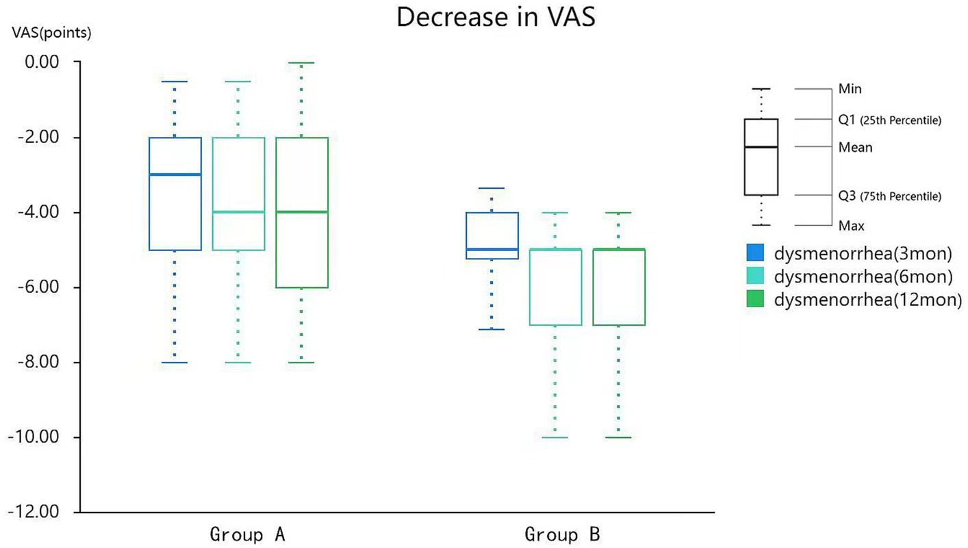 The clinical efficacy rates of dysmenorrhea (score reduction of 20–100%) at 3, 6, and 12 months were 81.16, 86.96, and 85.50%, respectively, in group A and 95.91, 97.95, and 97.95%, respectively, in group B. There was a significant difference between the clinical efficacy rates of dysmenorrhea in the two groups (Table 3).