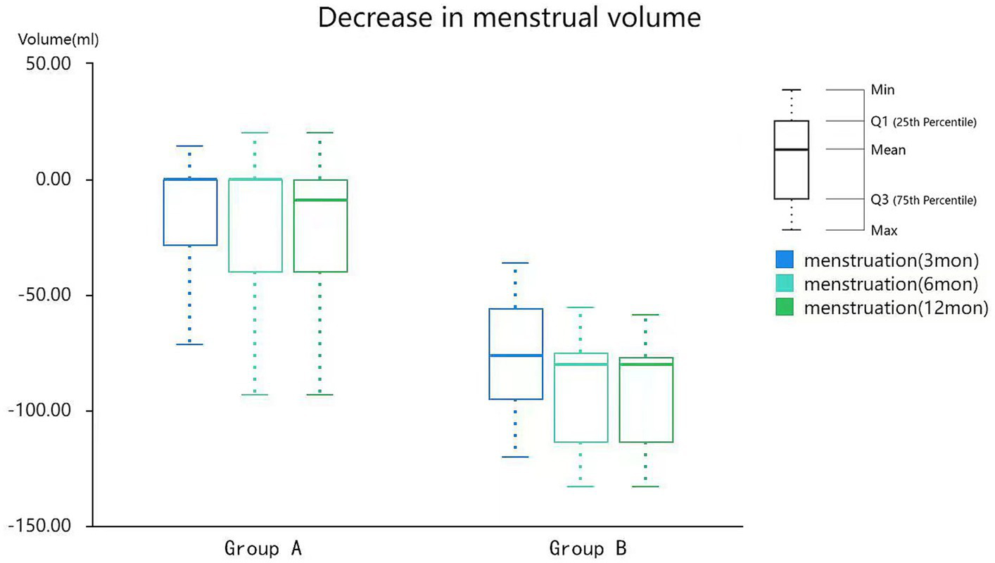 As shown in Table 4, the clinical efficacy rates of menstrual volume (score reduction of 20–100%) at 3, 6 and 12 months were 24.63, 30.43, and 36.23%, respectively, in group A and 89.80, 95.91, and 94.80%, respectively, in group B. There was a significant difference between the clinical efficacy rates of menstrual volume in the two groups.