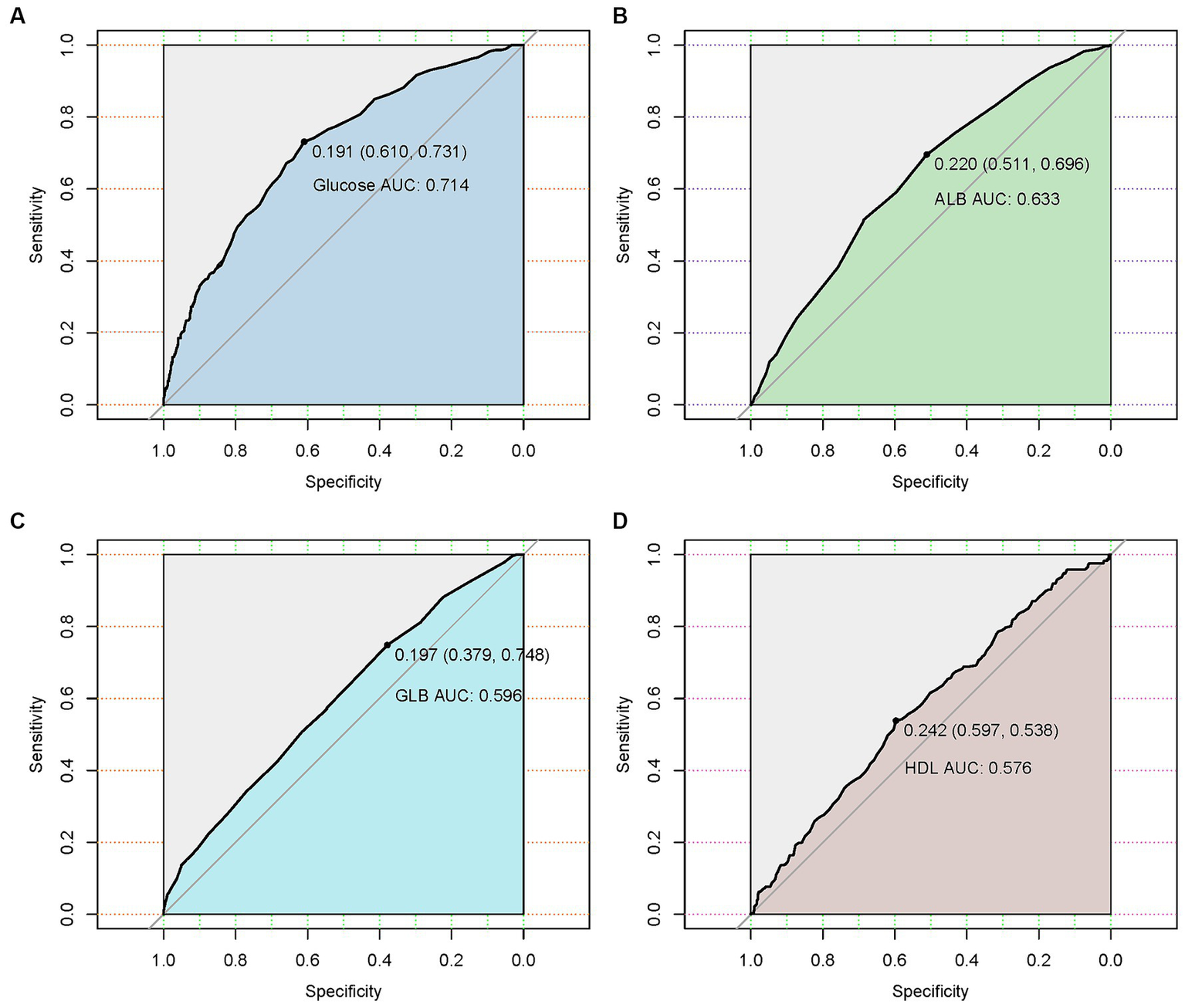 Figure 2. Receiver operating characteristic (ROC) curves of four hematological indicators (blood glucose, albumin, globulin, and high-density lipoprotein) predicting the presence of urinary tract infection in geriatric patients with hip fractures. (A) The ROC curve of blood glucose. (B) The ROC curve of albumin. (C) The ROC curve of globulin. (D) The ROC curve of blood glucose and high-density lipoprotein.