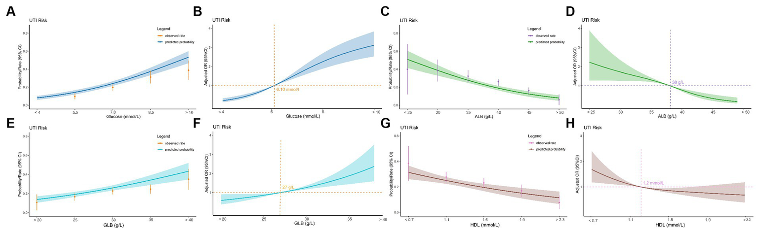 Figure 3. Relationship between four hematological indicators (blood glucose, albumin, globulin, and high-density lipoprotein) and UTIs in geriatric patients with hip fractures. (A) Predicted probabilities and the observed rate of UTIs (blood glucose). (B) Adjusted odds ratios (ORs) and 95% confidence intervals (CIs) are shown for each 1.5 mmol/L deviations away from the reference value (blood glucosse). (C) Predicted probabilities and the observed rate of UTIs (albumin). (D) Adjusted odds ratios (ORs) and 95% confidence intervals (CIs) are shown for each 5.0 g/L deviations away from the reference value (albumin). (E) Predicted probabilities and the observed rate of UTIs (globulin). (F) Adjusted odds ratios (ORs) and 95% confidence intervals (CIs) are shown for each 5.0 mmol/L deviations away from the reference value (globulin). (G) Predicted probabilities and the observed rate of UTIs (high-density lipoprotein). (H) Adjusted odds ratios (ORs) and 95% confidence intervals (CIs) are shown for each 0.4 mmol/L deviations away from the reference value (high-density lipoprotein).
