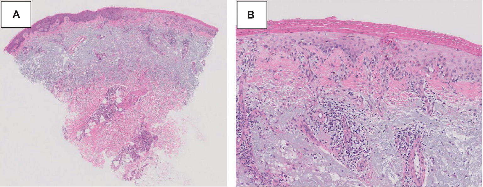 Figure 2. ICI-induced SCLE histopathologic appearance. Histopathologic sections of a hematoxylin and eosin-stained skin biopsy revealed vacuolar interface change along the dermal-epidermal junction associated with dyskeratotic keratinocytes and a perivascular lymphocytic infiltrate at 20× (A) and 100× (B) magnification.
