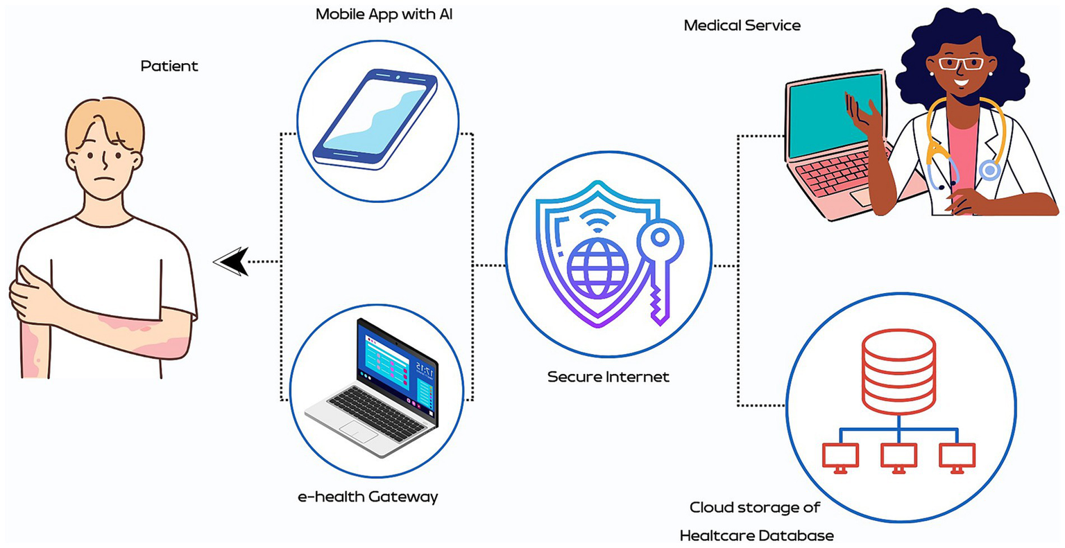 Artificial intelligence (AI)-enhanced telemedicine for remote monitoring of Hansen’s disease (HD). It features an AI-powered mobile app that tracks symptoms and provides diagnostic guidance, enhancing patient engagement and self-care. The e-health gateway securely integrates patient data into healthcare networks via the internet, ensuring data privacy. Healthcare professionals use telemedicine platforms to access and manage this data, supported by a secure cloud database for real-time analysis. This integrated system ensures personalized and timely medical services, improving care continuity and health outcomes for HD patients, even in remote areas.