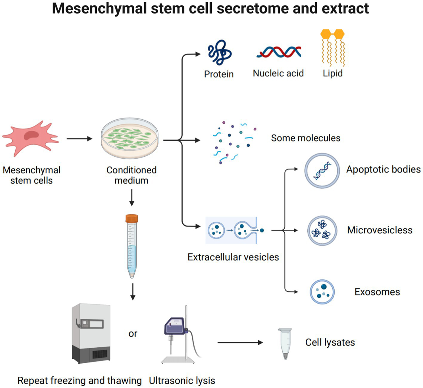 Figure 5. Mesenchymal stem cell secretome and extract. The MSC secretome, or CM, plays a major role in the use of MSCs to treat diseases. It is a variety of molecules and extracellular vehicles (EVs) secreted by MSCs into the extracellular space. These molecules include soluble proteins (such as growth factors, chemokines, enzymes, adhesion molecules, hormones, antimicrobial peptides, etc.), free nucleic acids, lipids, etc. EVs can be classified into apoptotic bodies (1–5 μm), microvesicles (250–400 nm), and exosomes (30–150 nm), according to their size and origin. Cell lysate is obtained by lysing cells through ultrasonolysis or freeze–thaw technology.