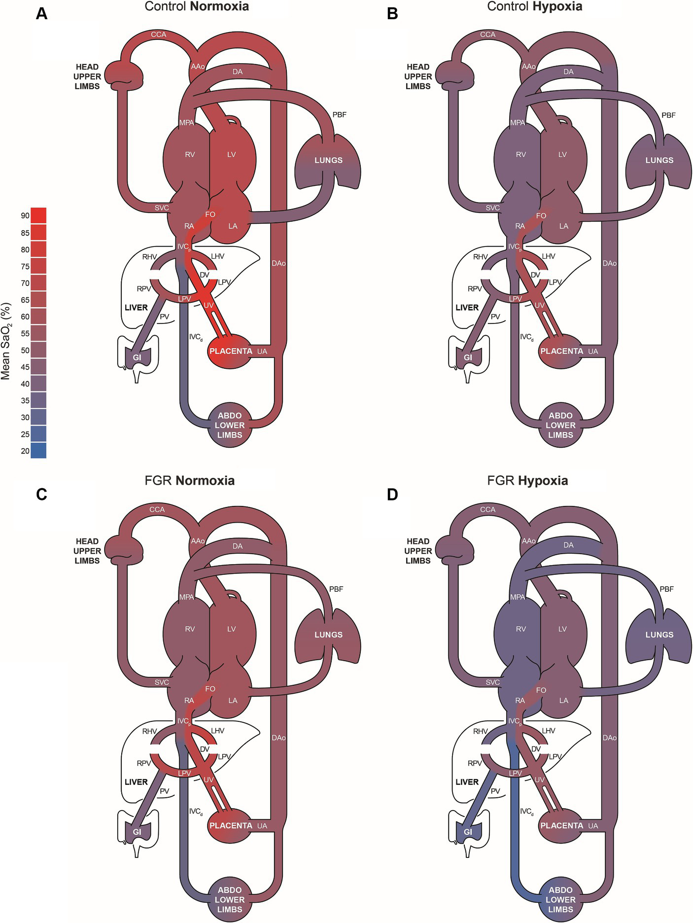 There was no impact of FGR or acute hypoxia on combined ventricular output (CVO; Figure 4A). Blood flow distribution as a % of CVO was altered such that there was an increased proportion of blood flow through the FO in FGR fetuses during both the normoxia and acute hypoxia states. Blood flow distribution toward the brain through the carotid arteries (CCa) was higher in FGR than control fetuses during the normoxia state but not different during the acute hypoxia state (Figure 4B). Diagrammatic representations of oxygen transport throughout the fetal circulation in control and FGR fetuses during normoxia and acute hypoxia states are shown in Figure 5.