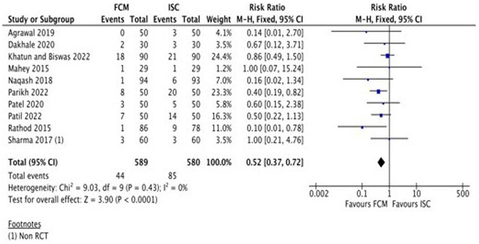 We identified 255 studies and included 14 studies (11 RCT, one non-RCT, and two single-arm studies) with 1,972 participants for qualitative analysis and 10 studies in the meta-analysis. All the included studies detailed the use of FCM for anemia. The primary outcomes assessed in the included studies were anemia, hemoglobin, and adverse events. The outcomes assessed ranged from 2 weeks to 12 weeks. The risk of bias varied across different studies with different outcomes. FCM is consistent with a fewer number of adverse events as compared to other interventions and provides “moderate” to “very low” QoE.