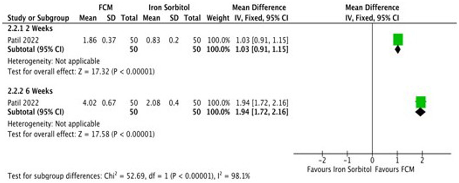 The clinical heterogeneity was assessed using the Chi2 test (p value <0.1 for statistical significance) and quantified with the I2 statistic. Heterogeneity was considered considerable if I2 exceeded 75%, substantial between 50 and 90%, moderate between 30 and 60%, and mild if below 40%. In cases of statistical heterogeneity (I2 ≥ 50%), we conducted prespecified subgroup analysis and employed a random-effects model to explore potential causes. Subgroup analyzes were performed based on ferric carboxymaltose administration duration.
