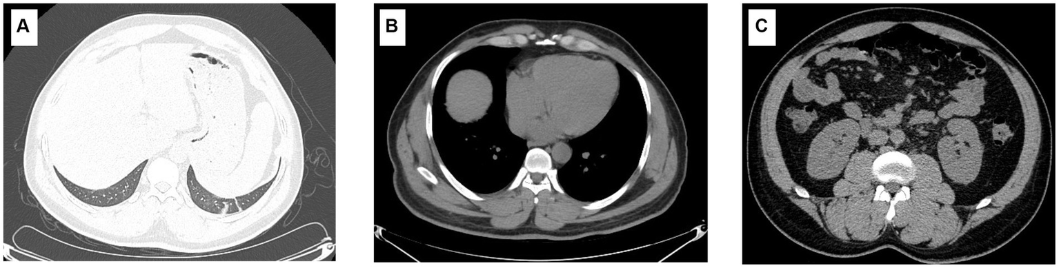 Imaging characteristics of the patient. The imaging findings show a few inflammatory cords in the lower lobe of the left lung as well as the middle lobe of the right lung (A); however, the typical symptoms of HFRS, including renal edema, perirenal fascial edema, pleural effusion, and pericardial effusion, were not found (B,C).