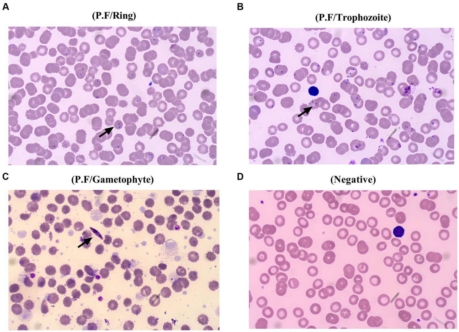 Different stages of Plasmodium falciparum presented in the peripheral blood of the patient. The ring of Plasmodium falciparum was found in the peripheral blood of the patient from the first day to the second day of admission (A), and later, trophozoite of Plasmodium falciparum was confirmed on the fifth day of hospitalization (B), followed by an emerging of gametophyte at the seventh day of hospitalization (C), and plasmodium cannot be found at the 10th day of admission, which is beneficial from a precise differential diagnosis and effective specific treatment (D).