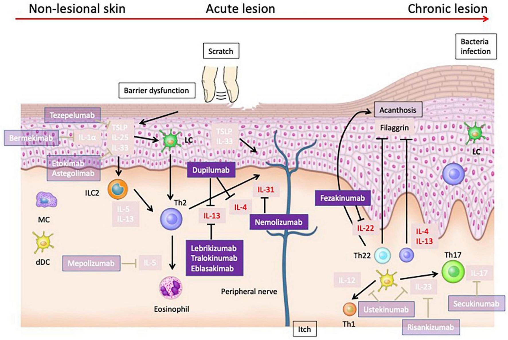 Pathogenesis and Therapeutic Targets of Atopic Dermatitis: Insights from Mouse Models and Human Specimens. The barrier dysfunction that occurs in the early stages of AD facilitates the penetration of allergens into the skin, and damaged keratinocytes produce cytokines such as TSLP, IL-25, and IL-33. These cytokines activate Th2 cells and ILC2s, leading to the production of Th2 cytokines. Additionally, TSLP matures Langerhans cells (LCs) in the epidermis and induces Th2 cells. During the acute phase, the skin barrier continues to deteriorate further. Damaged keratinocytes release various chemokines such as CCL17/thymus and activation-regulated chemokine and CCL22/macrophage-derived chemokine, as well as cytokines like TSLP, IL-1β, IL-25, and IL-33. These mediators activate ILC2 and Th2 cells at the lesion site. ILC2 cells produce IL-5 and IL-13, while Th2 cells produce IL-4, IL-13, IL-31, and IL-5. In the chronic phase, not only Th2 cells but also Th22 and Th17 cells increase in number, leading to suppression of filaggrin expression by IL-4, IL-13, and IL-22, further deteriorating the epidermal barrier function. Additionally, IL-4 and IL-13 suppress the production of AMPs, weakening the barrier function against microbes. Th17 and Th22 cells also produce IL-22, which induces epidermal thickening.