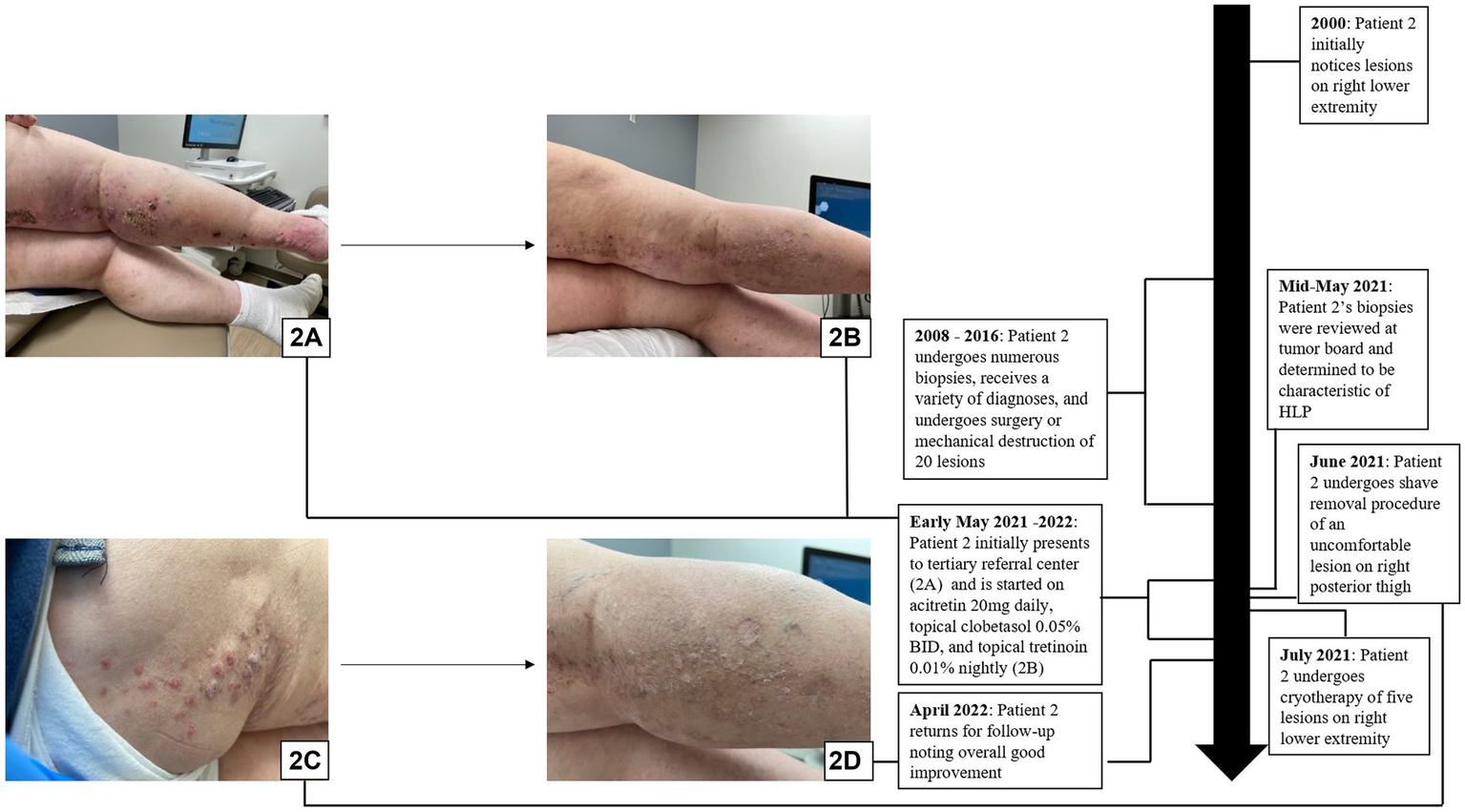 | Patient 2 | A 12 cm hyperpigmented, erythematous plaque studded with hyperkeratotic papulonodules that extended from the right inguinal fold to the right anterior thigh in a blaschkoid distribution. The right posterior leg had a large linear plaque studded with hyperkeratotic papules. | Many biopsies were performed over 8 years, leading to an array of diagnoses. Lower extremity surgeries had a protracted course of healing, and each surgery was painful, impacting the patient’s comfort. | Treated with acitretin 20 mg daily, clobetasol 0.05% cream every morning, and tretinoin 0.1% cream every night, along with shave removal of a 2.3 cm lesion on the right posterior thigh and cryotherapy of several hyperkeratotic lesions. The patient noted overall good improvement on follow-up 6 months later. |