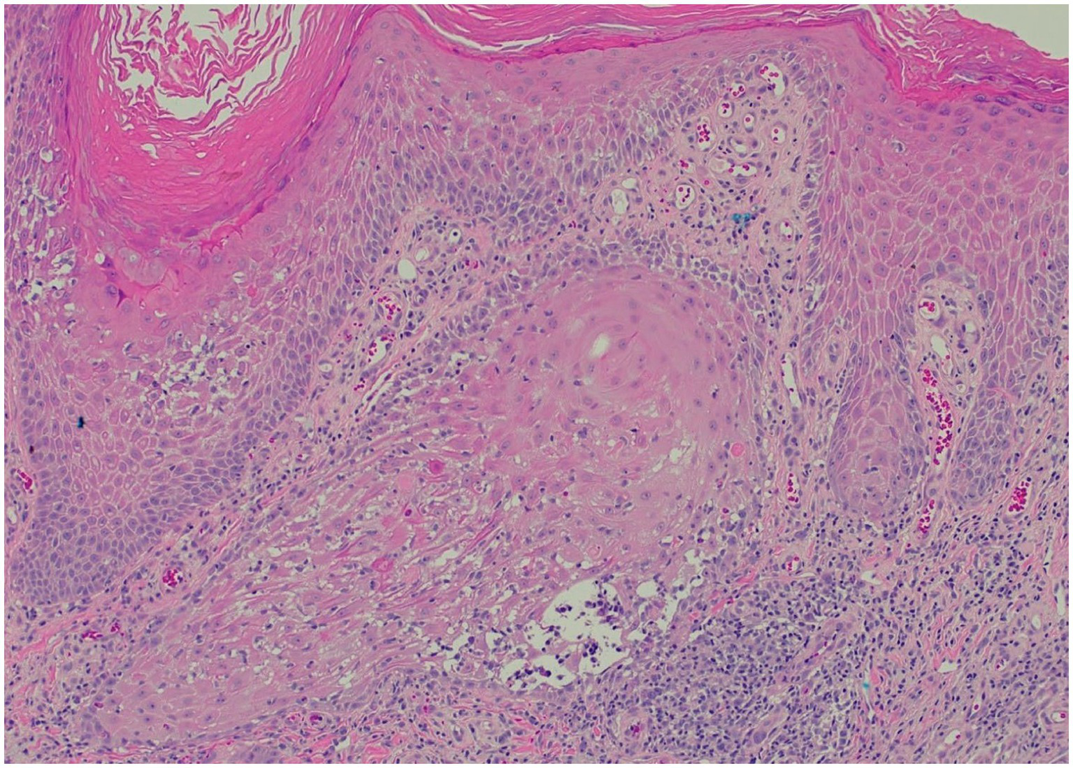 Clinically, HLP plaques are frequently located on the distal lower extremities and are associated with follicular accentuation (4, 5). Additionally, patients may have no history of sun damage and no predisposing risk factors for cSCC (13). Histologically, HLP is notable for hyperorthokeratosis, wedge-shaped hypergranulosis, and irregular psoriasiform hyperplasia limited to the epidermis (Figure 3), while cSCC presents with cytologic atypia, extension beyond the superficial dermis, and other invasive characteristics (6, 13).