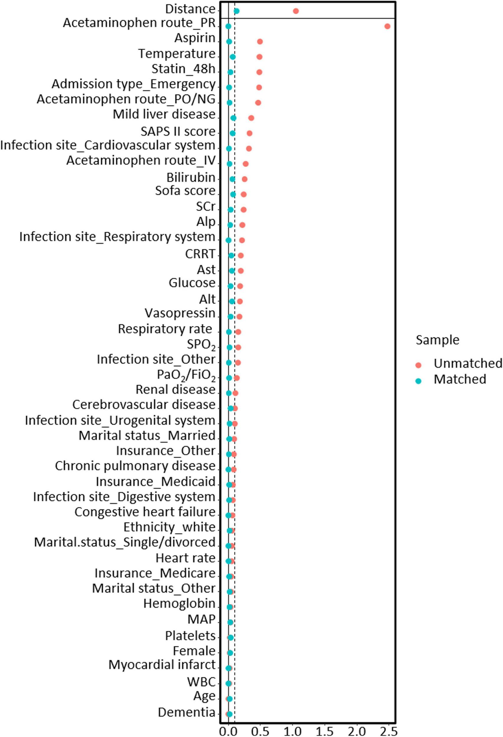 We used a predetermined set of covariates based on well-known predictors of sepsis outcomes (28, 30, 31). These factors included heart rate, mean arterial pressure (MAP), temperature, respiratory rate, SPO2, PaO2/FiO2, glucose levels, white blood cell (WBC) count, serum creatinine (SCr) levels, hemoglobin levels, platelet count, alanine aminotransferase (ALT), aspartate aminotransferase (AST), alkaline phosphatase (ALP), bilirubin, SOFA score, simplified acute physiology score (SAPS) II, infection site, and several comorbidities, like myocardial infarction, congestive heart failure, dementia, cerebrovascular disease, chronic pulmonary disease, mild liver disease, renal disease. Moreover, the use of medication such as statins, aspirin, vasopressin, continuous renal replacement therapy (CRRT) and acetaminophen route was considered. Important information from hospital admission records, including demographic characteristics, marital status, insurance details, and admission type, were also factored in. These variables comprehensively cover patient health behaviors, potentially revealing confounding effects in those treated with acetaminophen (32).