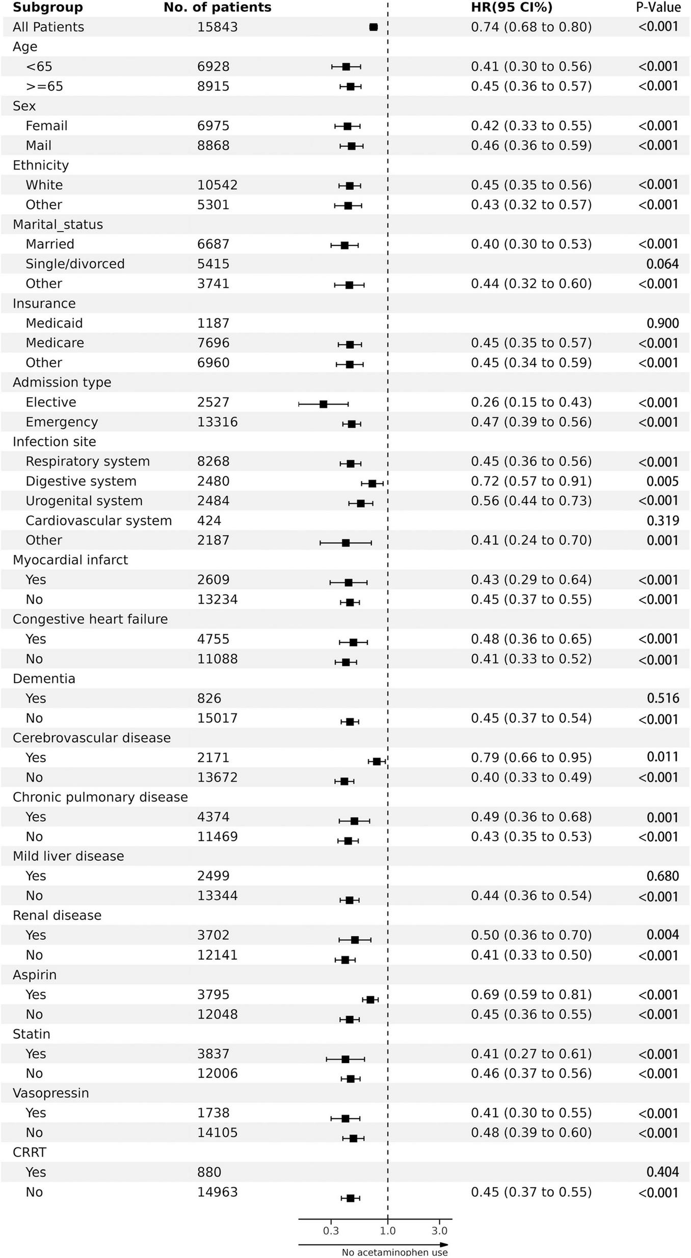 In our subgroup analysis, we investigated how factors such as age, sex, ethnicity, marital status, insurance, admission type, infection site, comorbidities, medication history, and intervention usage might affect the correlation between acetaminophen use and in-hospital mortality rates.
