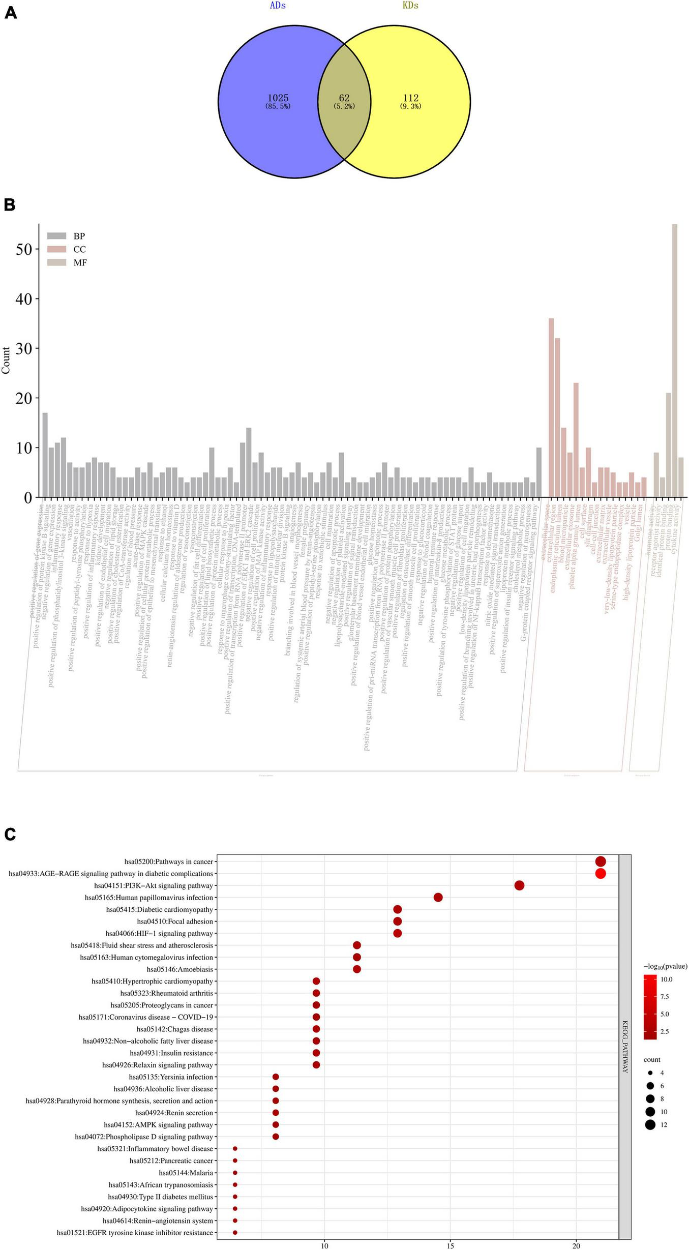 (A) Intersection targets of ADs and KDs; (B) GO enrichment analyses of intersection targets of ADs and KDs. The order from left to right is BP, CC and MF, the X-axis represents the function of GO, and the Y-axis represents the number of genes enriched by GO; (C) KEGG enrichment analyses of intersection targets of ADs and KDs. The X-axis represents the number of genes enriched by KEGG, and the Y-axis represents KEGG signaling pathway. The circle area indicates the number of targets, and the red color from deep to shallow indicates the enrichment degree from low to high. BP, biological process; CC, cell component; MF, molecular function.