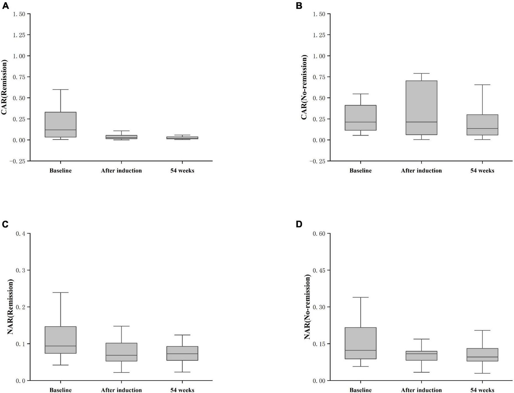 Differences in CAR and NAR at baseline, post-induction, and at 54 weeks between the remission and non-remission groups. (A) CAR (Remission), CAR achieving clinical remission at 54 weeks; (B) CAR (No-remission), CAR not achieving clinical remission at 54 weeks; (C) NAR (Remission), NAR achieving clinical remission at 54 weeks; (D) NAR (No-remission), NAR not achieving clinical remission at 54 weeks. The comparison was performed by the Kruskal-Wallis rank sum test.